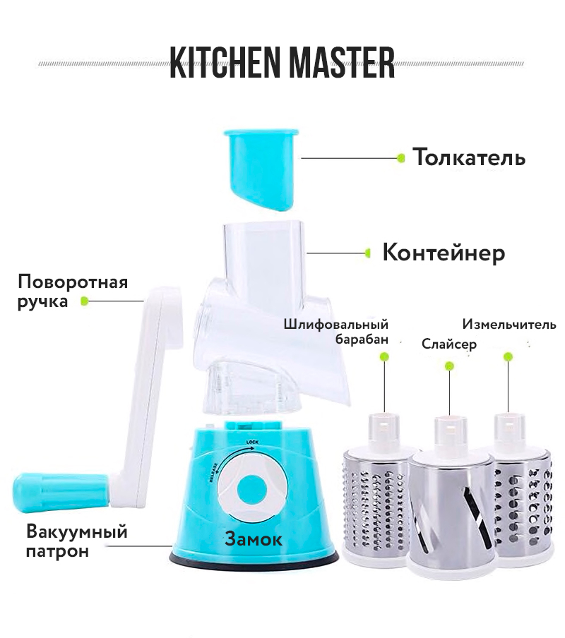Механическая тёрка — Kitchen Master по конструкции напоминает мясорубку, компактная и мощная барабанная тёрка с высокой производительностью.