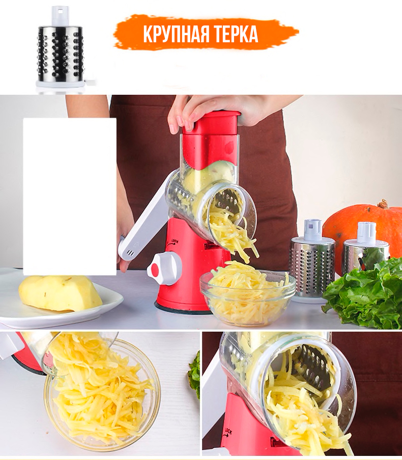 Теперь вам ненужно изнурять себя длительными натиранием и нарезанием продуктов так необходимых для приготовления вкусных блюд, чтобы покормить себя, своих близких или нагрянувших гостей. Механическая тёрка — Kitchen Master, сделает эти все процессы практически сама, Вам нужно будет только крутить ручку, и вы больше не будете чувствовать усталости в руках после готовки очередного ужина, обеда или завтрака.![]()