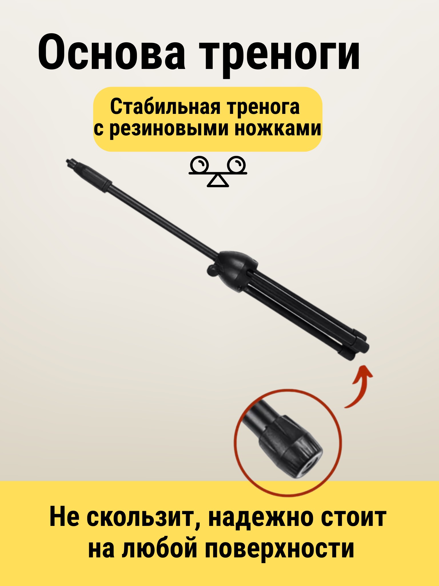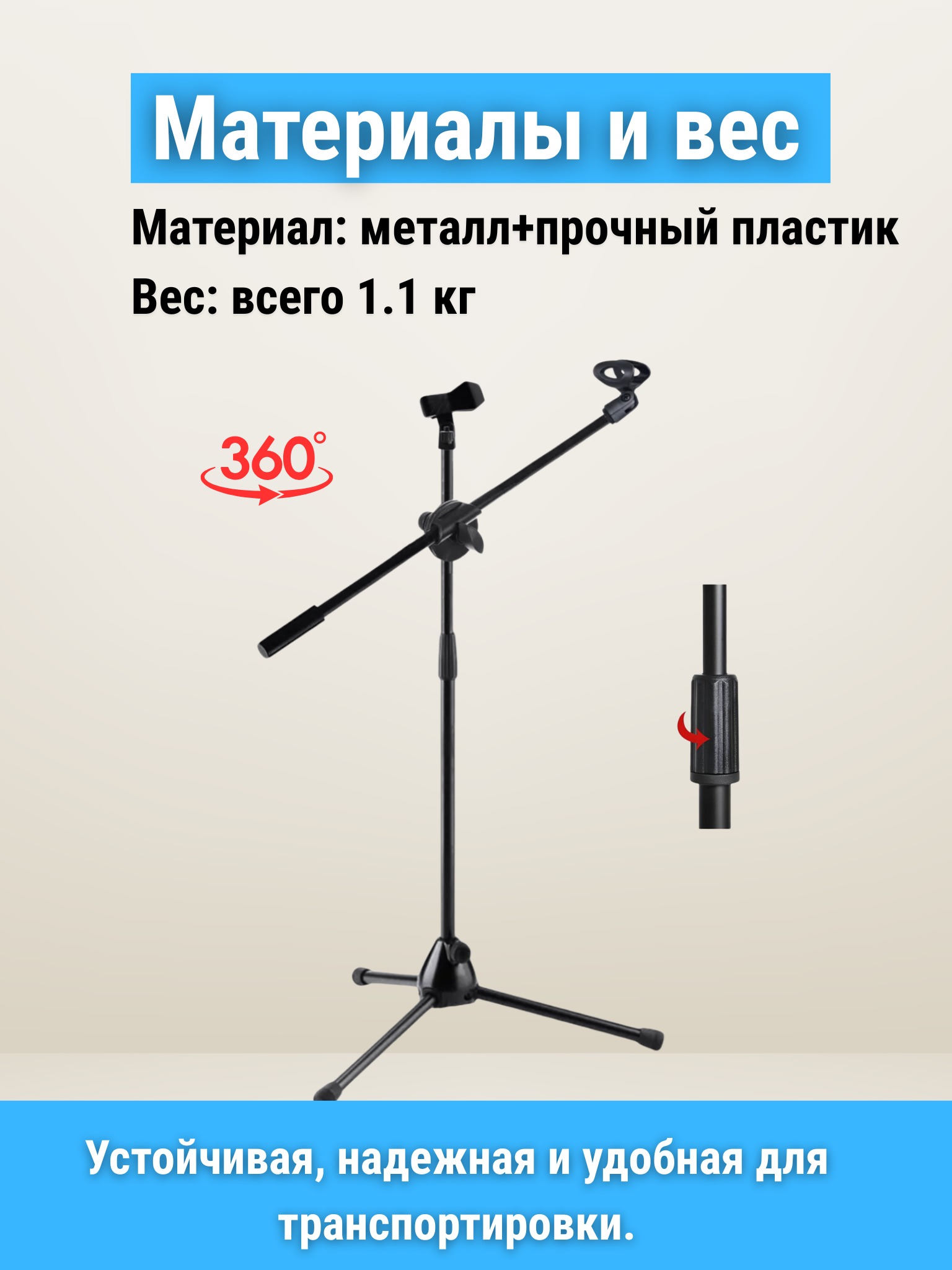Основание выполнено из металлических труб, а соединения и крепления — из прочного пластика, что обеспечивает надежность и устойчивость при длительном использовании. Тренога оснащена резиновыми накладками, которые предотвращают скольжение и обеспечивают устойчивость на гладкой поверхности. Также предусмотрена прищепка для крепления микрофонного кабеля.