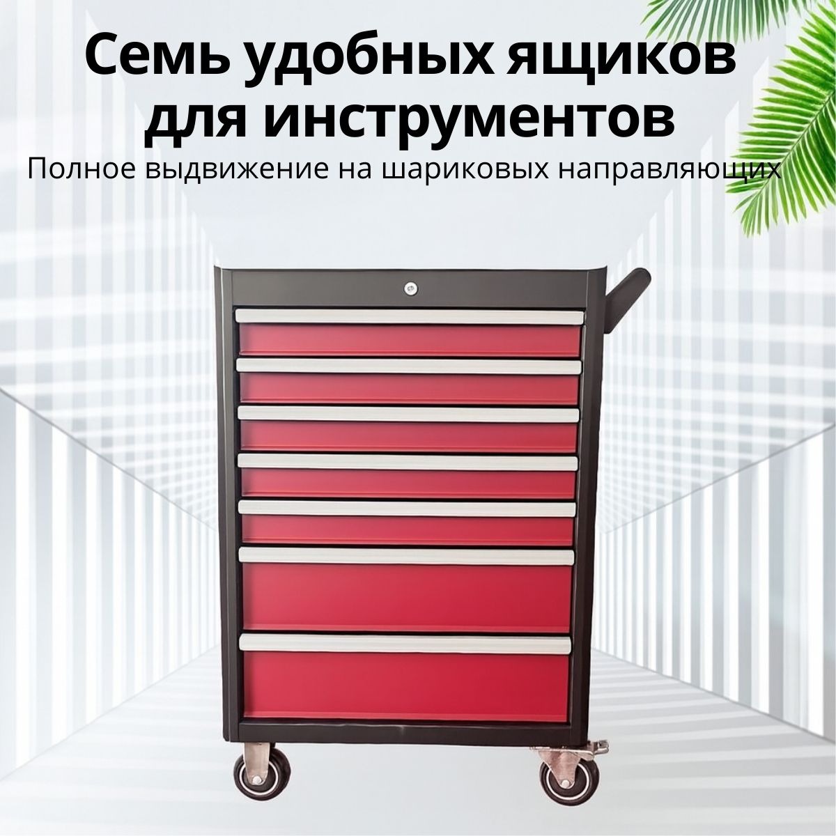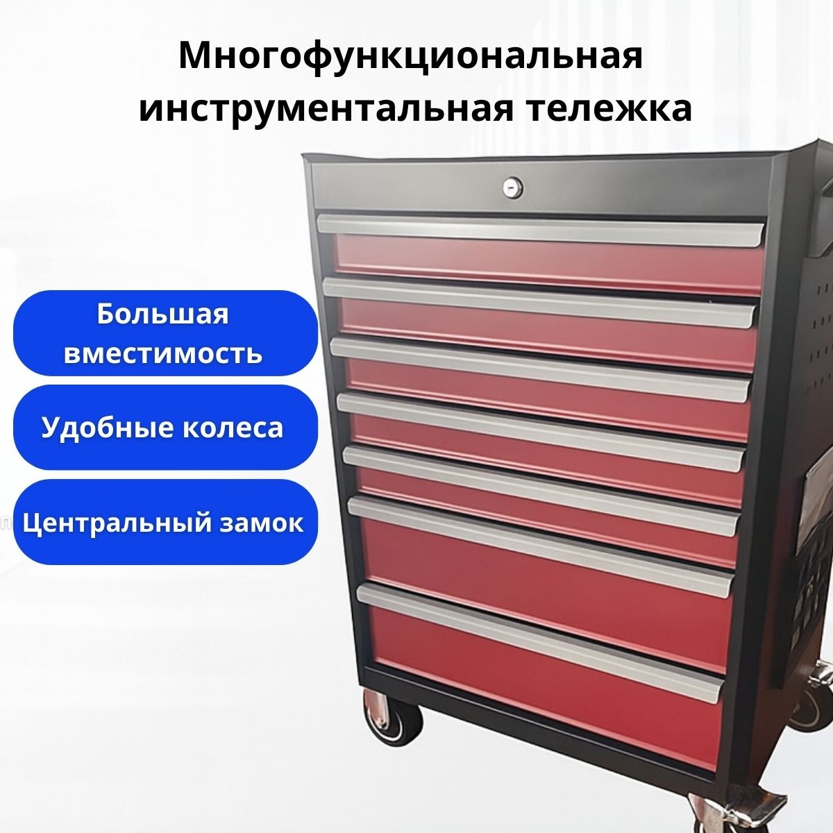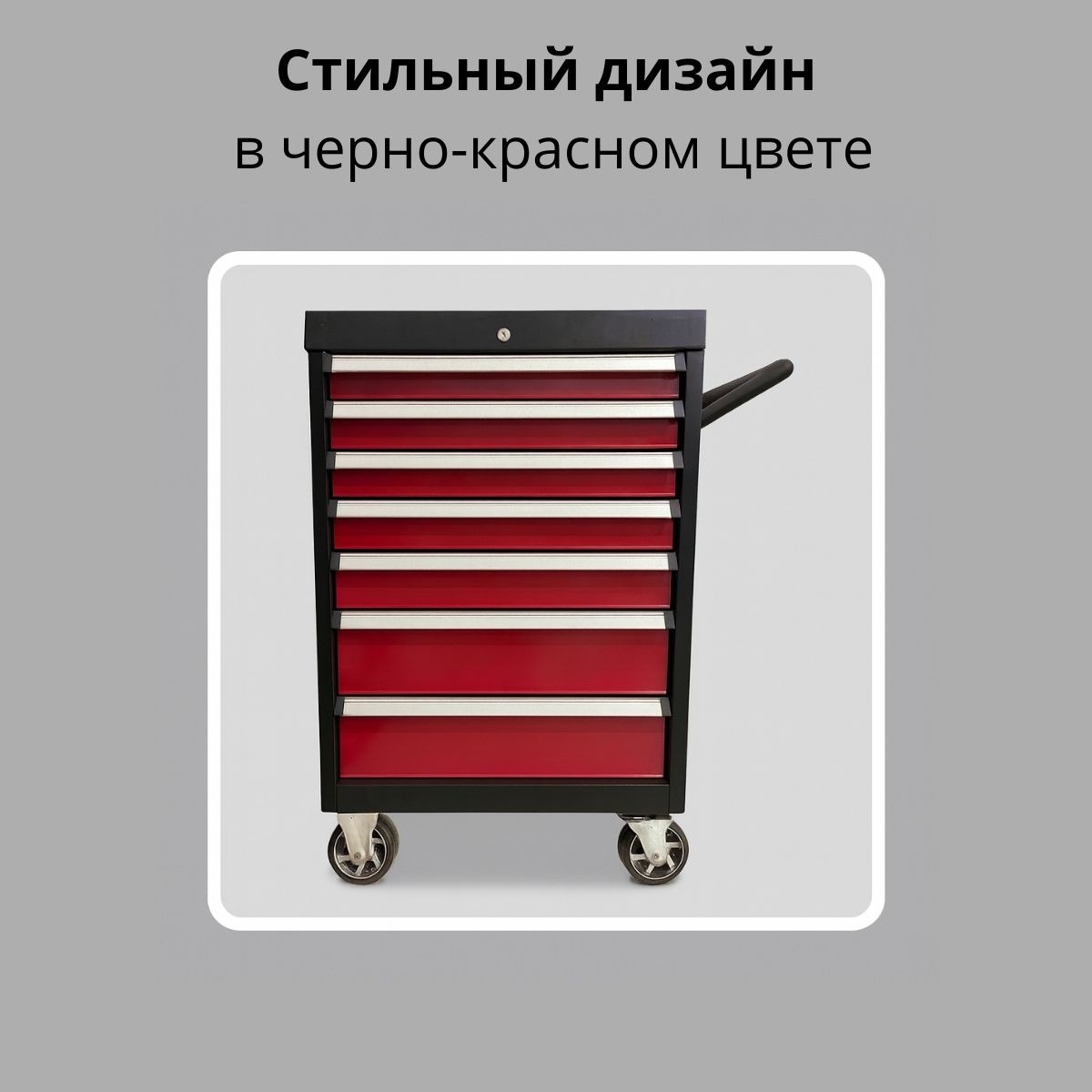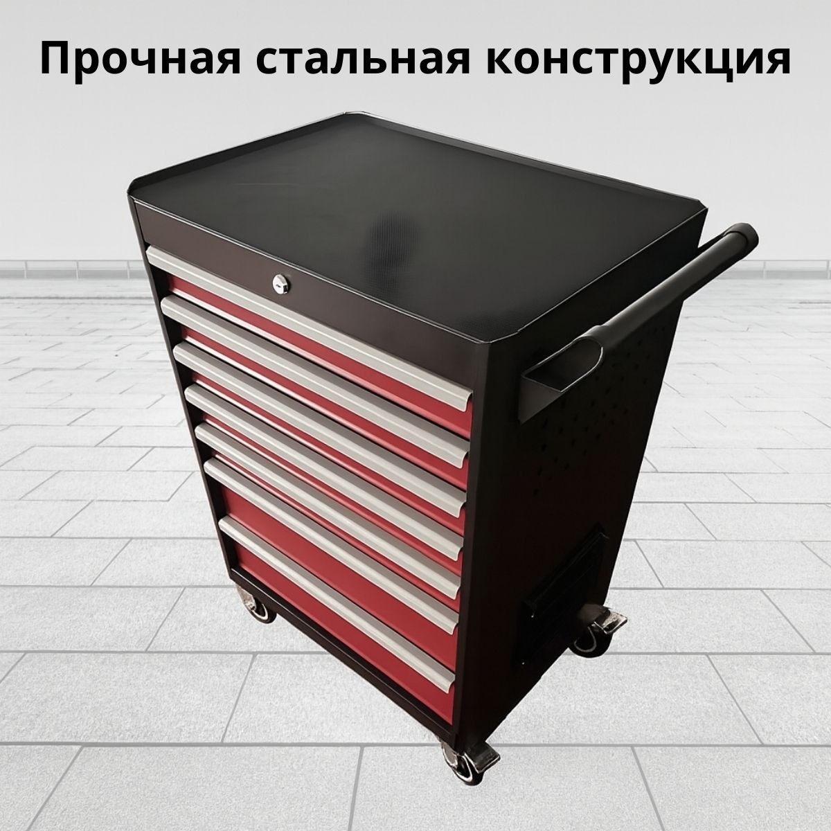 Тележка оснащена 7 выдвижными ящиками на шариковых направляющих с полным выдвижением. Каждый ящик закрывается клавишным замком а для дополнительной защиты предусмотрен центральный замок. На боковой стенке есть перфорация для установки крючков и подвесного инструмента.