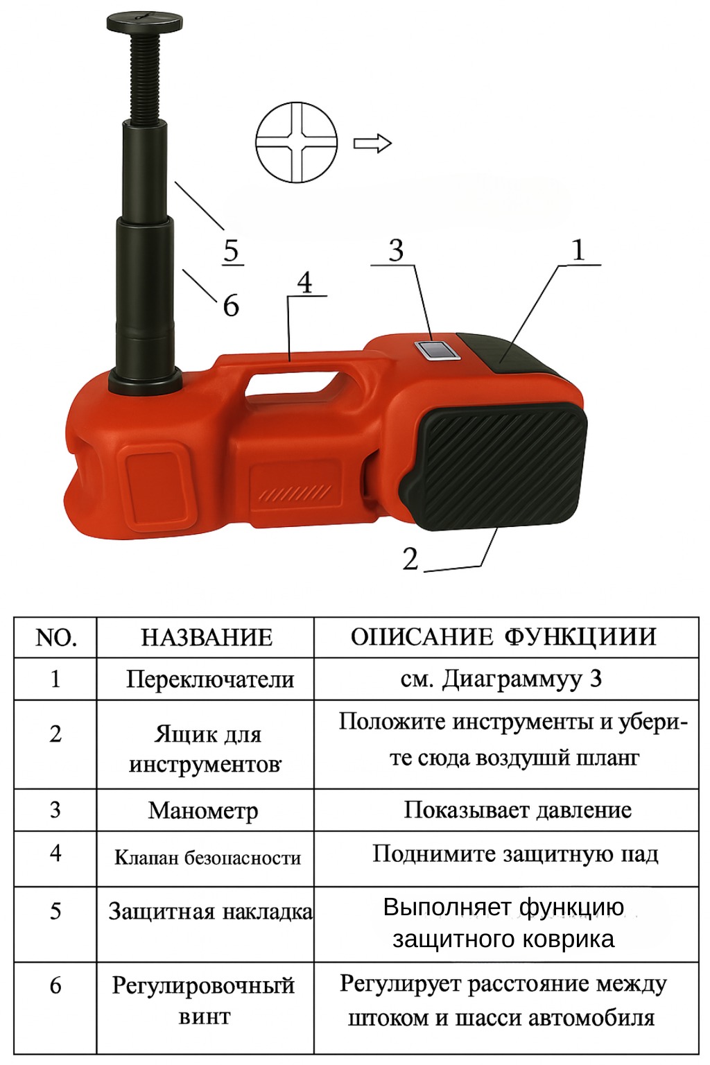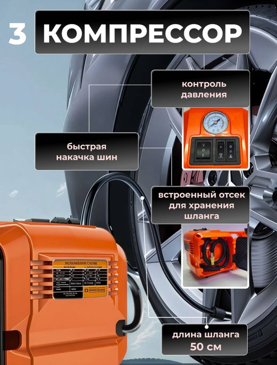 Функциональность 3 в 1: совмещает функции домкрата, компрессора для подкачки шин и светодиодного фонаря для работы в темное время суток.