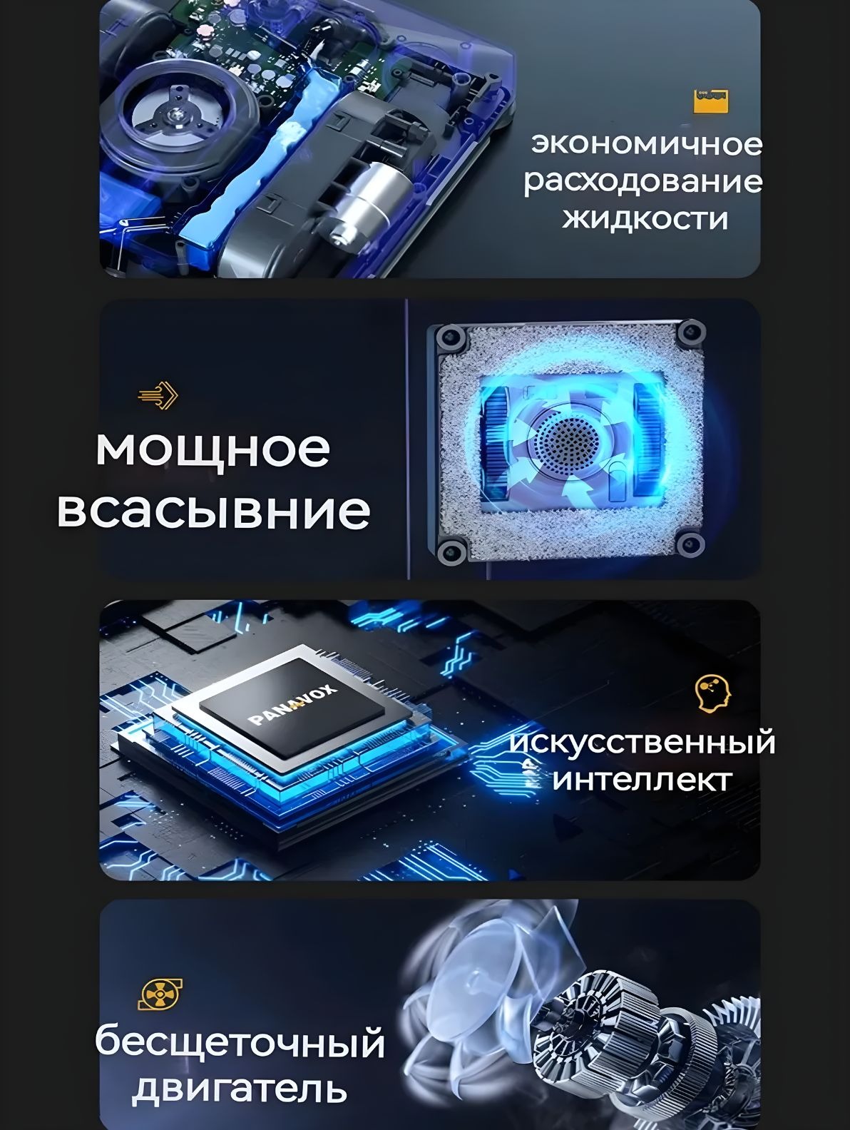 Скорость очистки составляет 1 м2 за 4 минуты, доступно 3 режима работы для разных уровней загрязнения. Модель оснащена функцией автоматического распыления воды с резервуаром на 100 мл, что обеспечивает равномерное увлажнение поверхности.