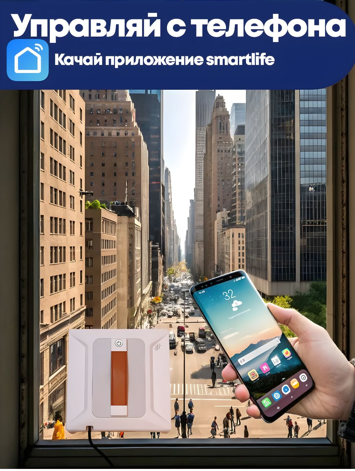 Для безопасности предусмотрен встроенный аккумулятор 650 мАч, который удерживает устройство на стекле до 20 минут при отключении питания. Также в комплекте есть страховочный трос и система защиты от падения. Управление осуществляется с помощью пульта дистанционного управления или через приложение на смартфоне по Bluetooth.