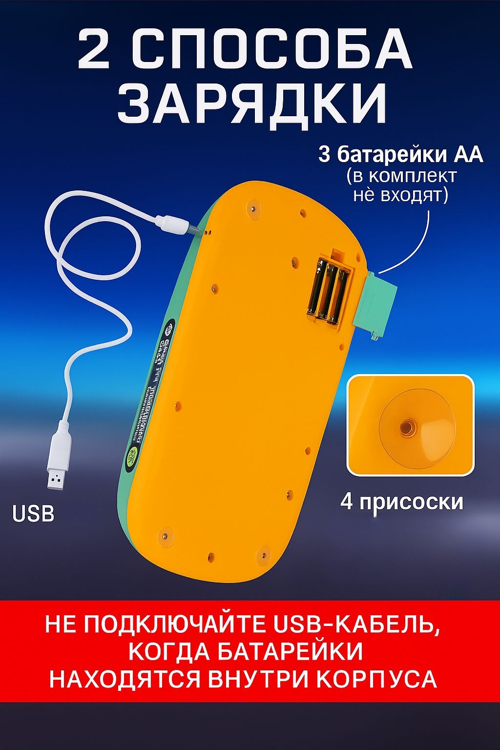 Питание: USB-кабель или 3 батарейки AA
