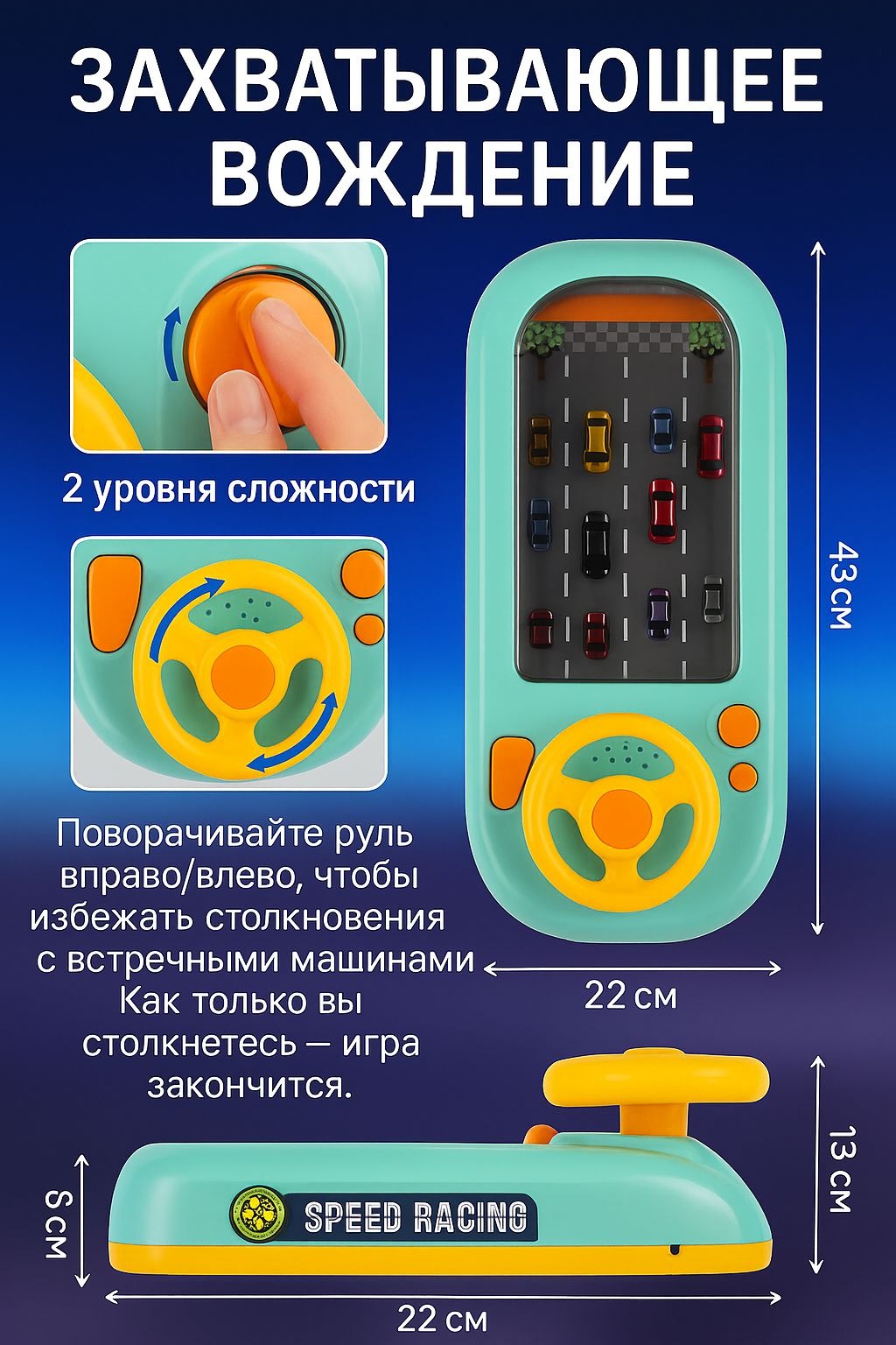 Игрушка позволяет изменять скорость движения, добавляя процессу азарта и реалистичности.
