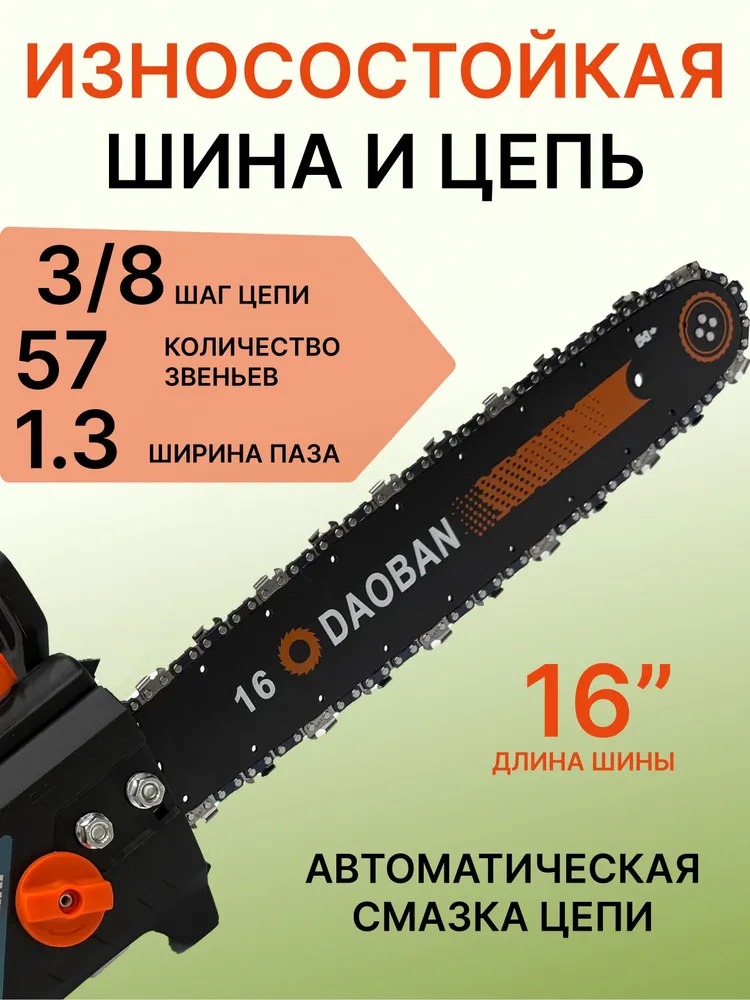 Инструмент оснащён автоматической системой смазки цепи, которая продлевает срок службы шины и цепи, обеспечивая стабильную и плавную работу даже при высоких нагрузках. Шина длиной 16 дюймов (40 см) позволяет легко справляться как с тонкими ветками, так и с толстыми брёвнами.