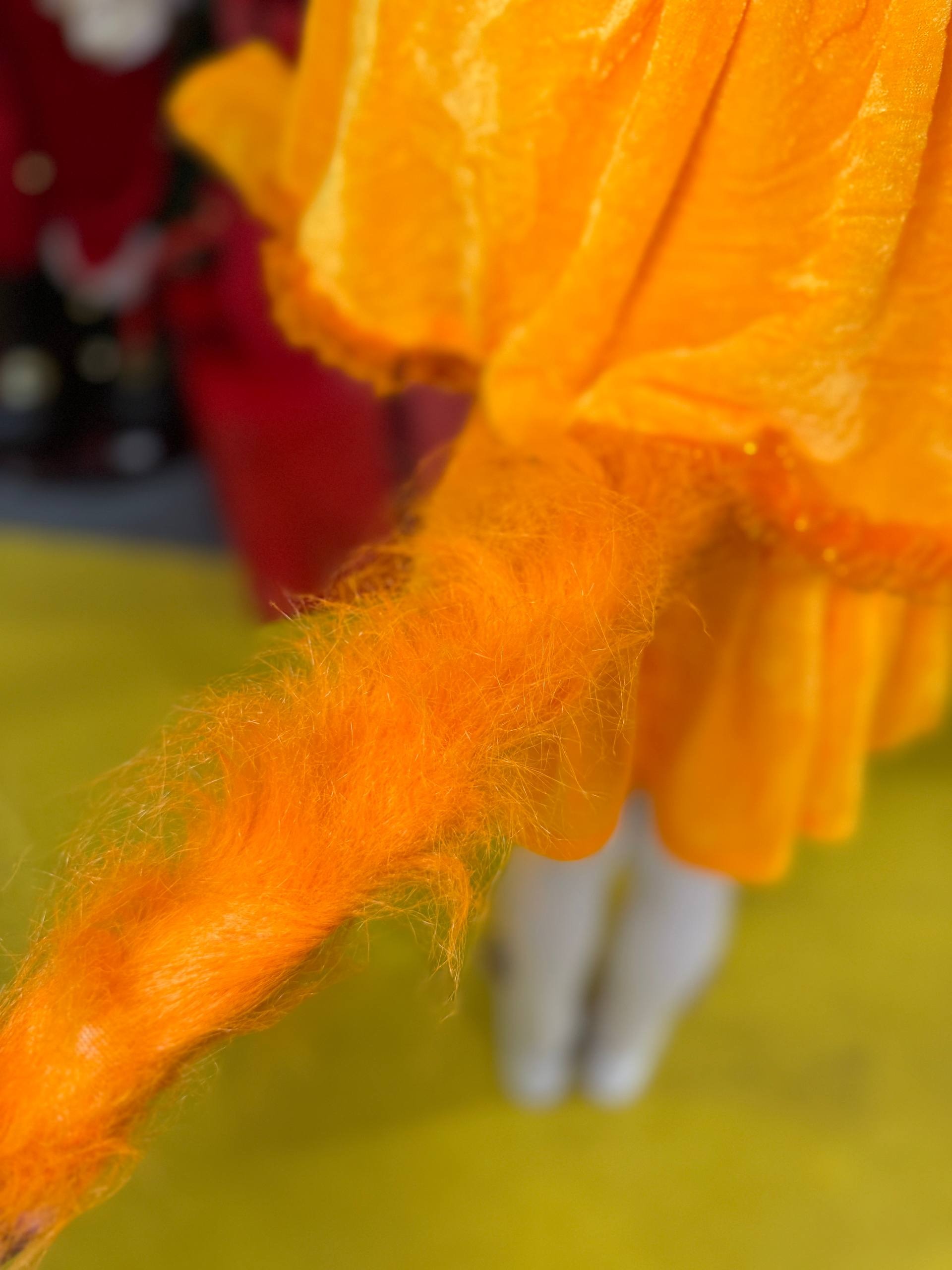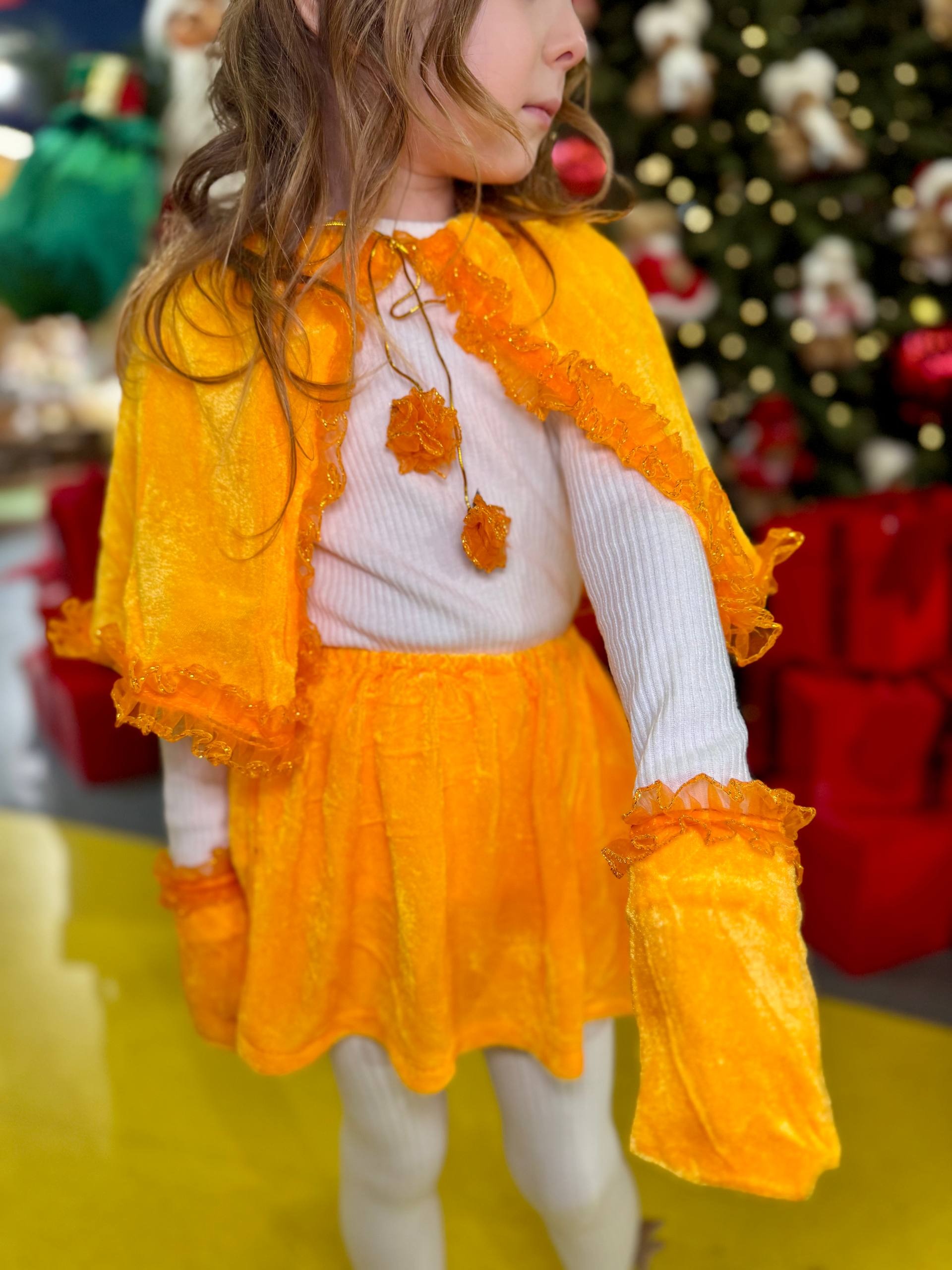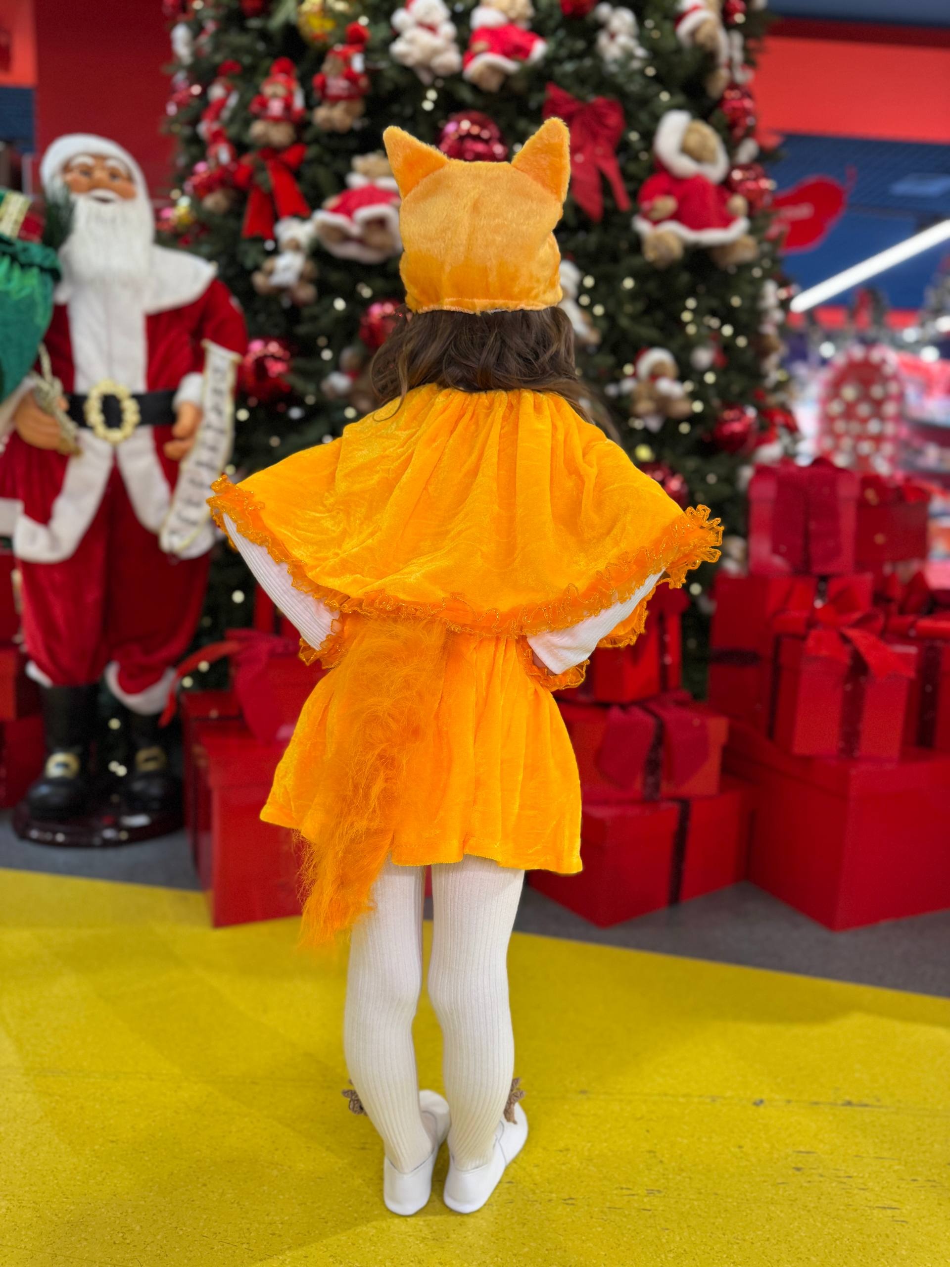 Костюм выполнен из мягких и приятных на ощупь материалов с бархатистой текстурой. Он лёгкий, не стесняет движений и комфортен даже при активных играх. Ткань красиво смотрится на свету, а тёплый оранжевый цвет делает образ особенно выразительным и нарядным. Шапочка с ушками удобно фиксируется и завершает костюм, добавляя ему очарования.