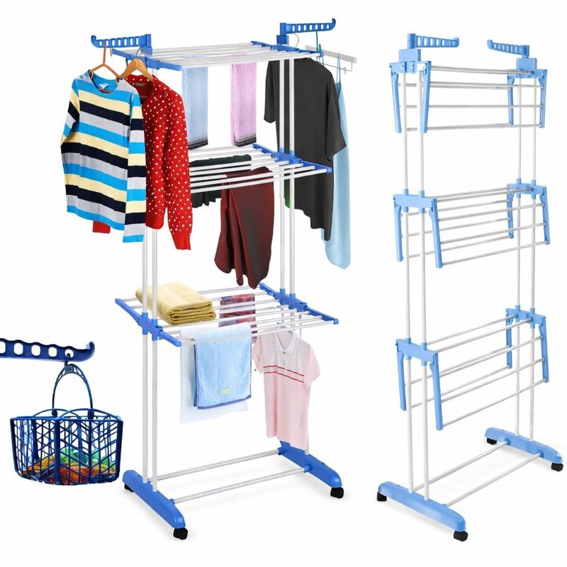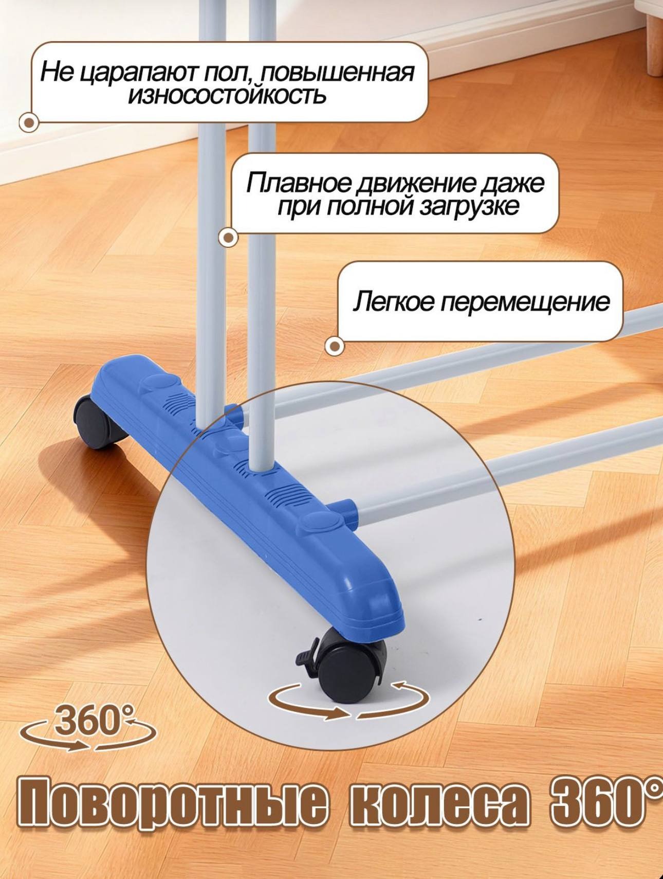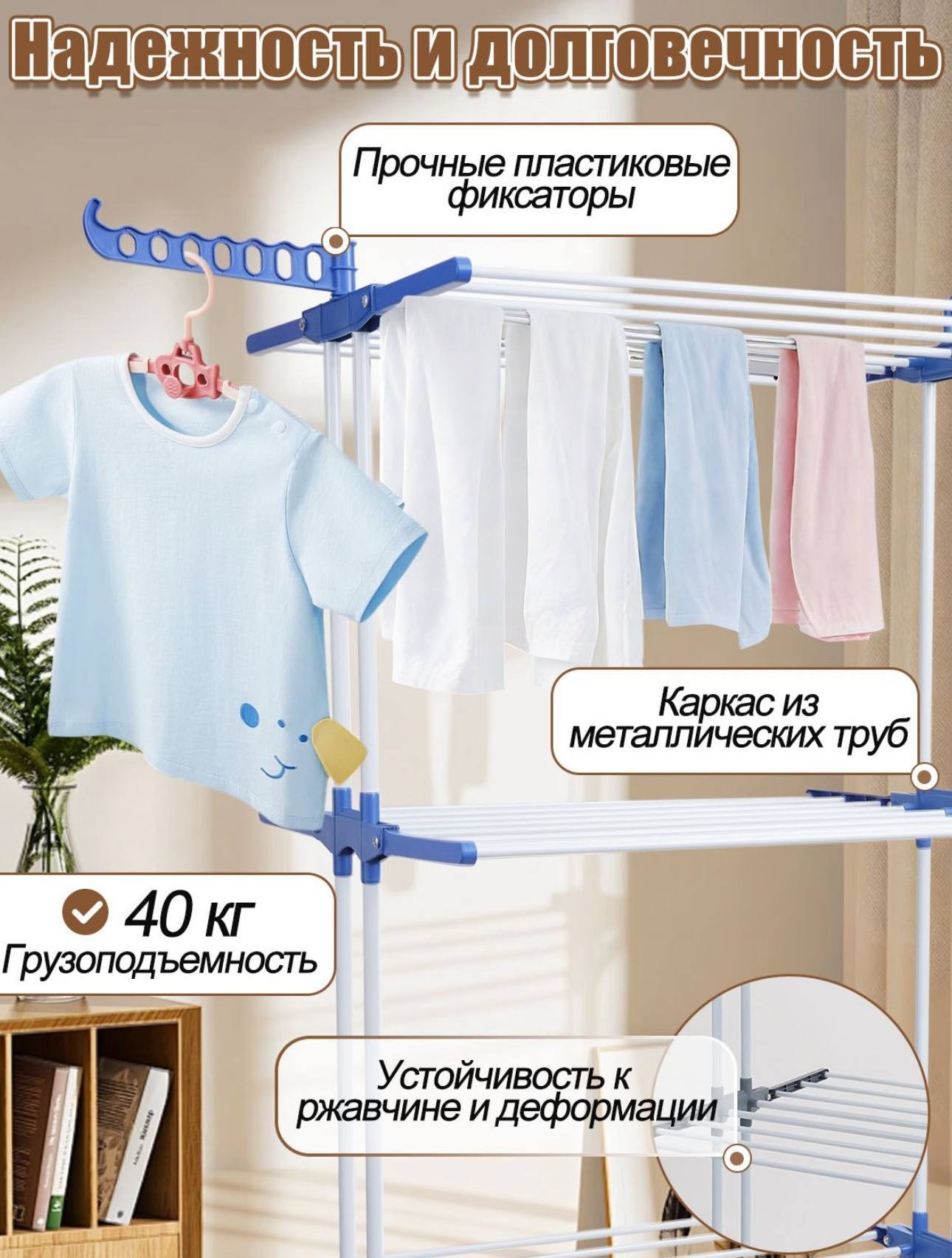 Прочный металлический каркас обеспечивает устойчивость и долгий срок службы, а возможность регулировки полок позволяет удобно сушить одежду разных размеров — от мелкого белья до полотенец и даже обуви.