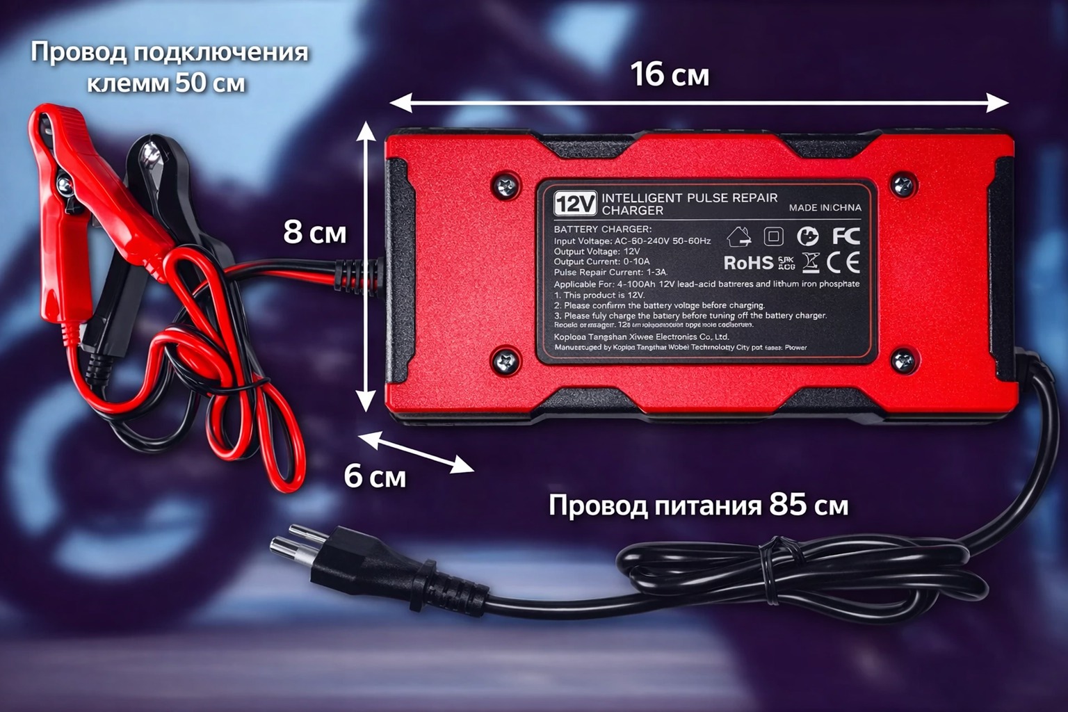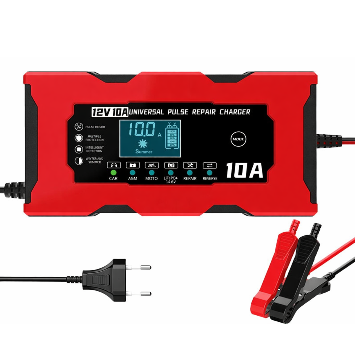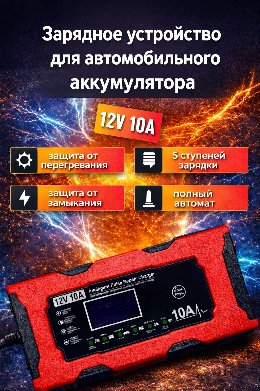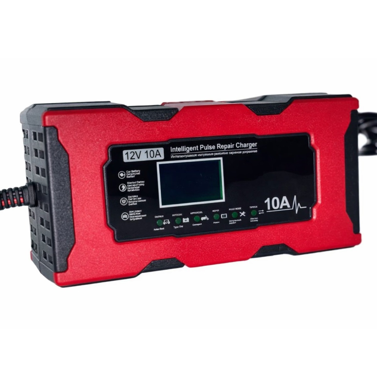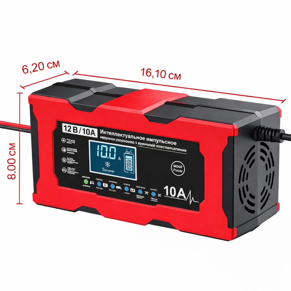Встроенный цифровой дисплей отображает ключевые параметры: напряжение, силу тока, уровень заряда и статус процесса зарядки, что позволяет полностью контролировать процесс. Многоуровневая защита от перегрева, перегрузки, короткого замыкания и переполюсовки гарантирует безопасность как для аккумулятора, так и для автомобиля.