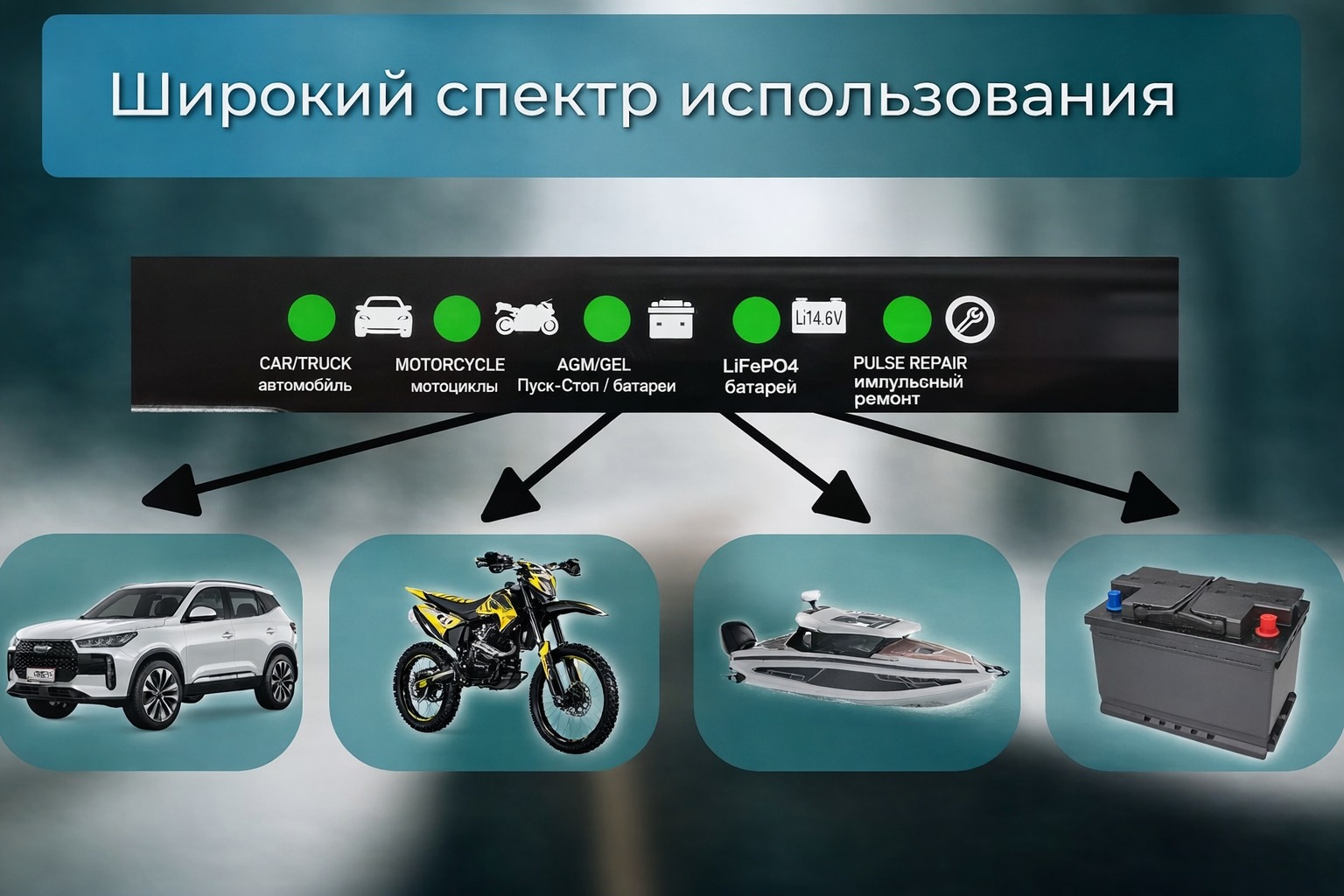 - Назначение: легковые автомобили, мотоциклы, спецтехника, ИБП