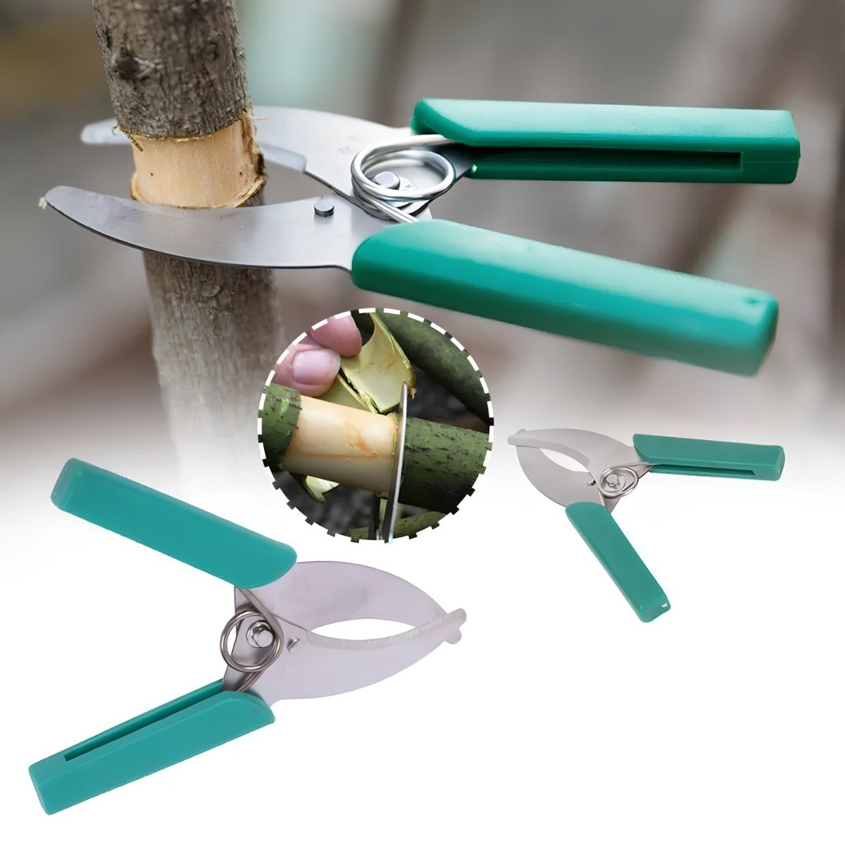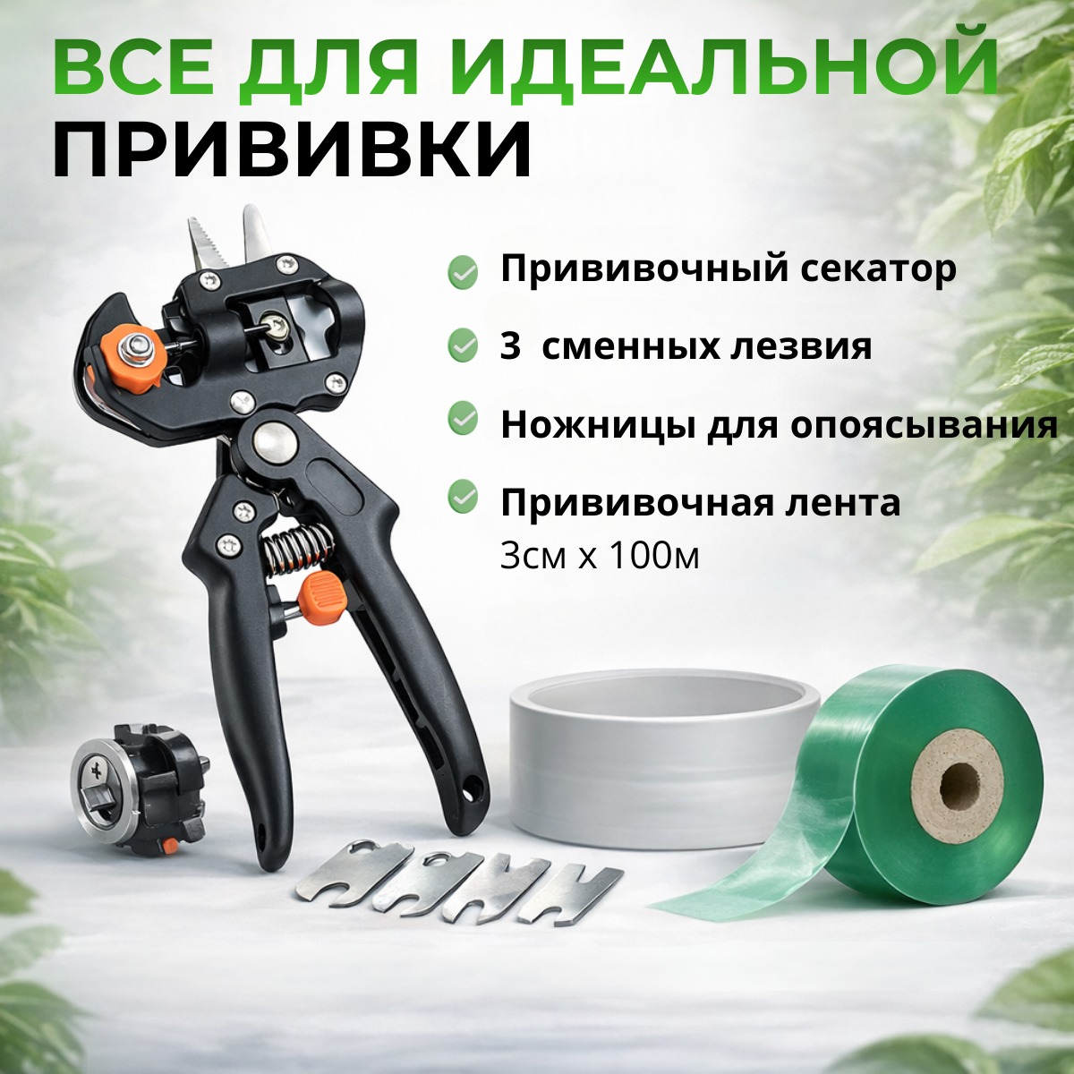 Основой набора является прививочный секатор с тремя сменными лезвиями различной формы. Высокая точность и чистота среза обеспечивают идеальное соединение привоя и подвоя, что способствует быстрому срастанию и активному росту растения. Лезвия изготовлены из высокоуглеродистой стали SK5, устойчивой к коррозии, и позволяют выполнять ровный срез без сминания древесины.