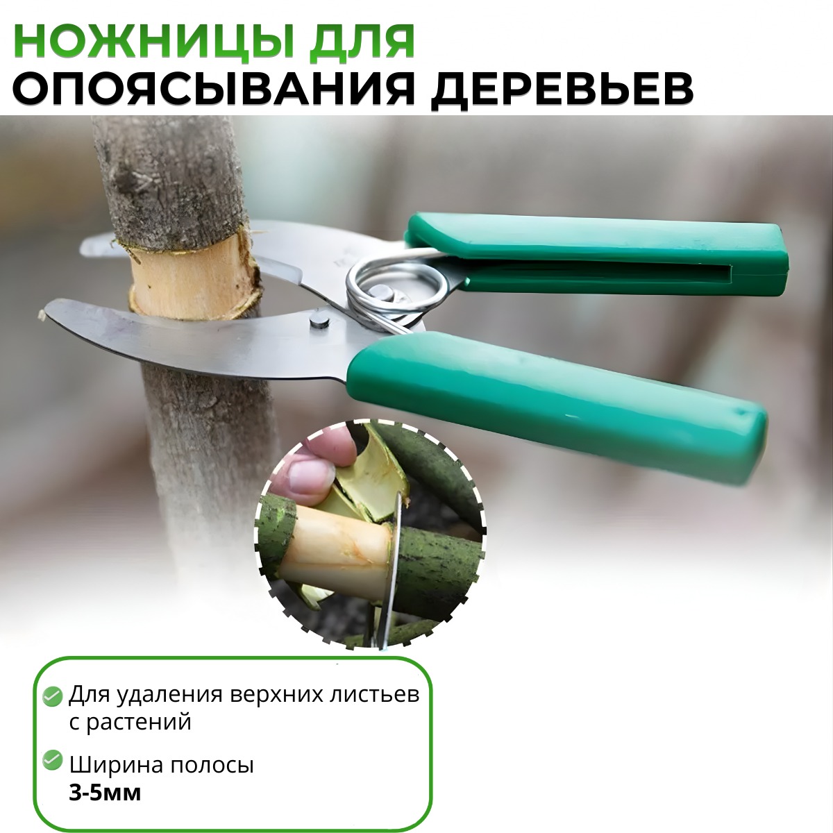 Дополнительно в набор входят садовые ножницы для опоясывания деревьев. Они используются для удаления верхних листьев и контроля распределения питательных веществ в растении, что положительно влияет на формирование плодов и соцветий.