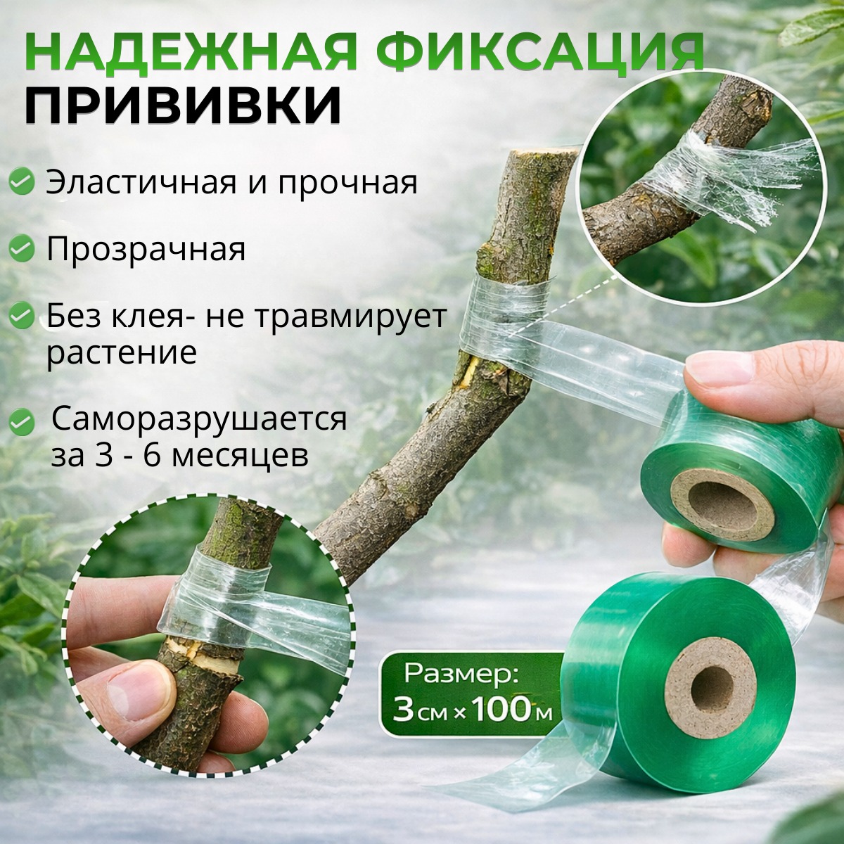 Прививочная лента обеспечивает надежную фиксацию привоя, защищает место прививки от влаги, микроорганизмов и вредителей, а также предотвращает избыточное выделение сока. Лента эластична, прозрачна и разрушается под воздействием солнечных лучей в течение сезона, не требуя снятия.