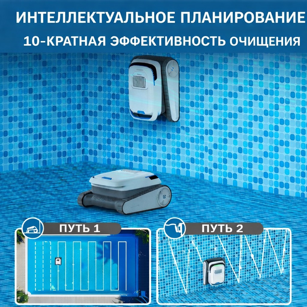 Современные сенсоры и алгоритмы движения обеспечивают зигзагообразную и дугообразную траекторию, позволяя роботу полностью охватывать всю поверхность бассейна, включая углы и труднодоступные зоны.