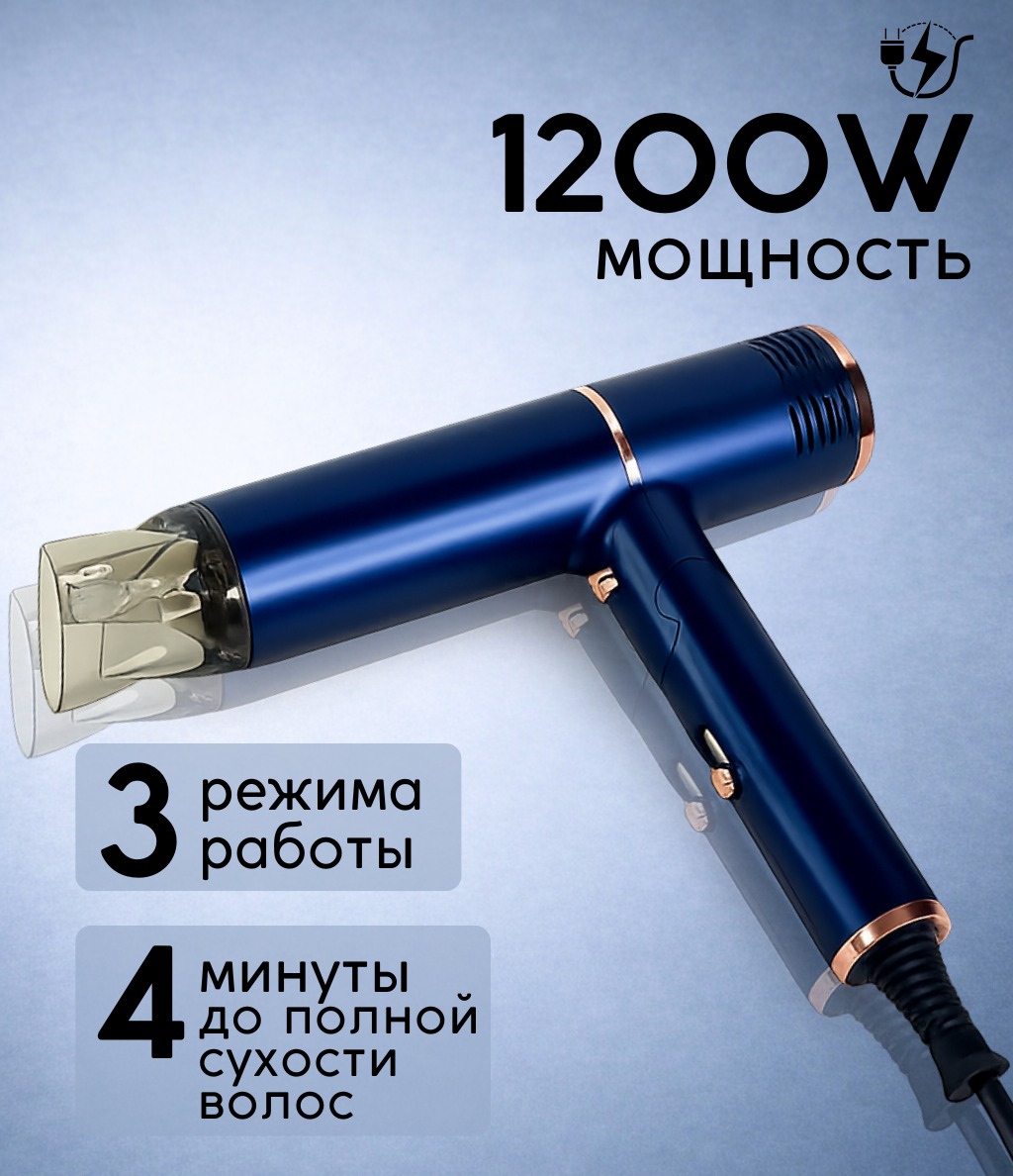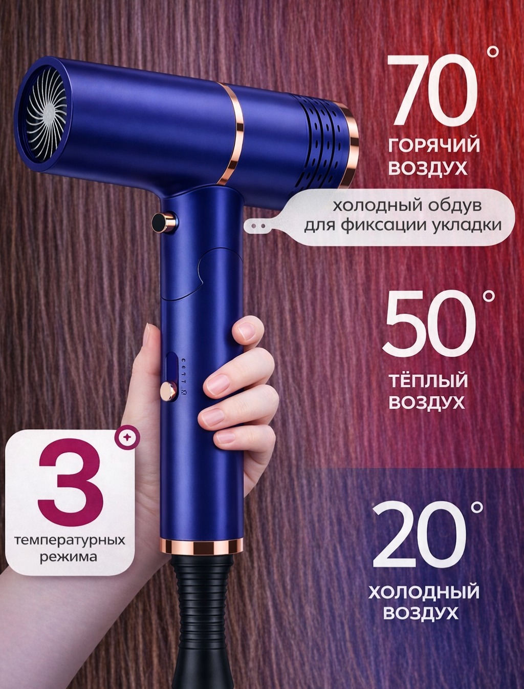 Фен для волос со складной ручкой, с температурными режимами, ионизацией и холодным обдувом.