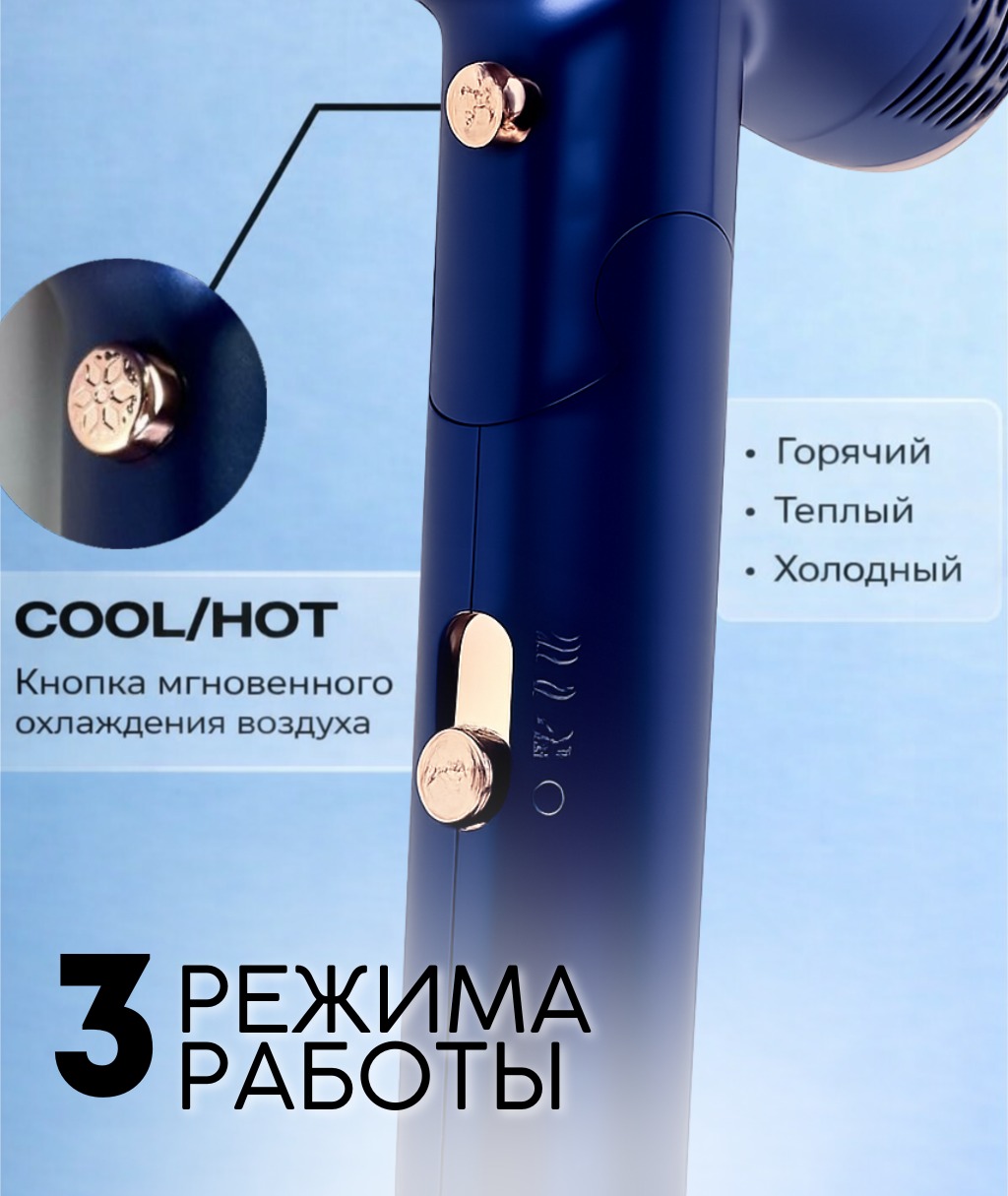 Фен оснащён несколькими температурными режимами, которые позволяют подобрать оптимальный уровень нагрева для вашего типа волос — от бережной сушки до профессиональной укладки. Функция холодного обдува надежно фиксирует результат причёски, придавая ей стойкость и блеск.