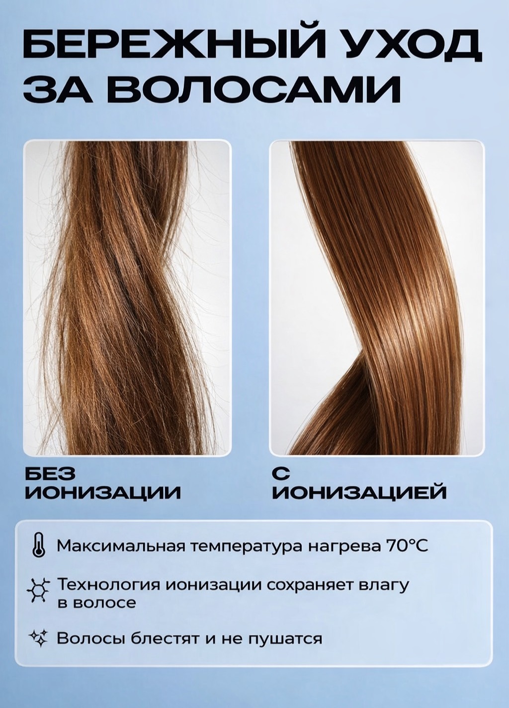Инновационная ионизация эффективно снижает статическое электричество, делает волосы гладкими и мягкими, предотвращает пушистость и придаёт здоровый, ухоженный вид.