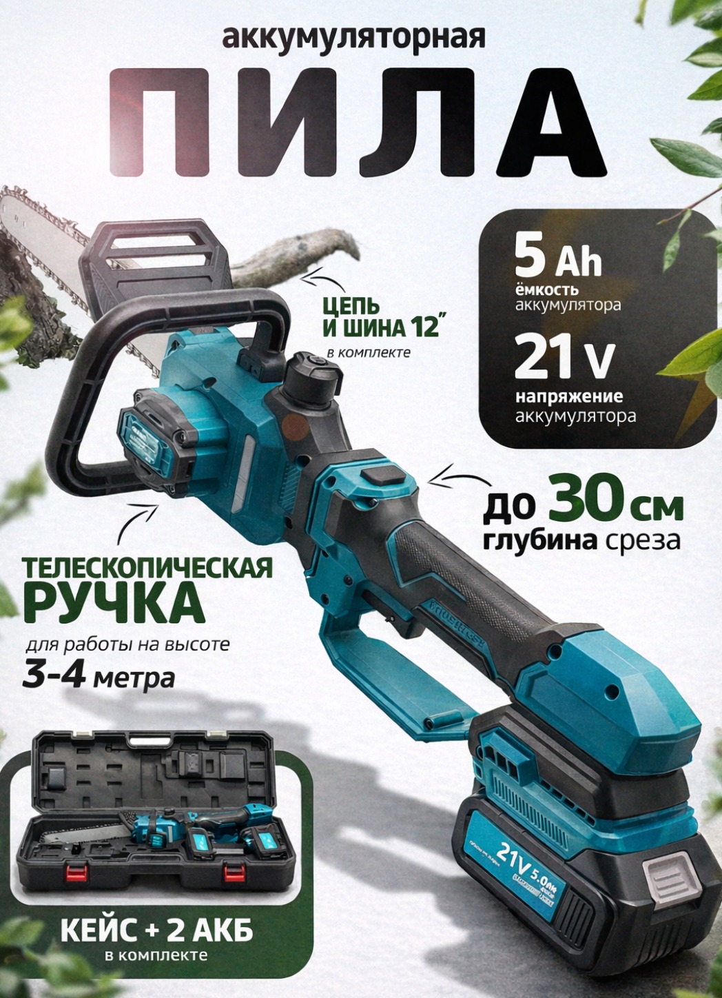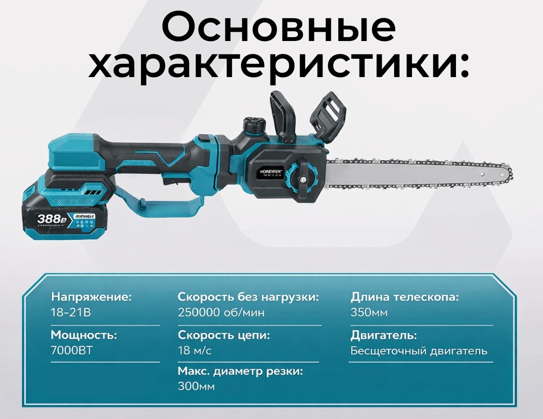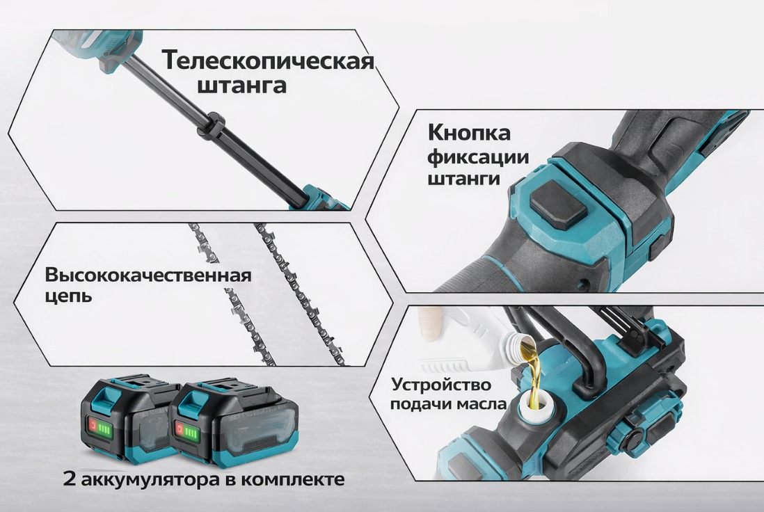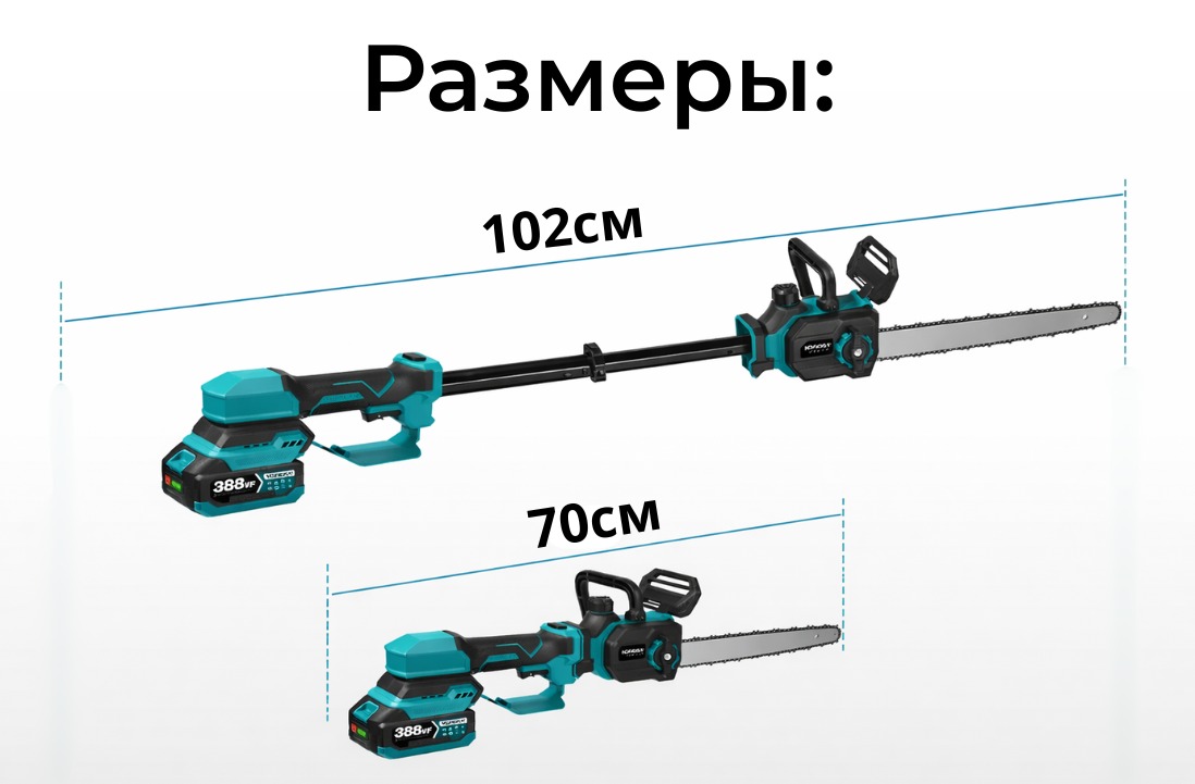 Аккумуляторная цепная пила 12 дюймов с телескопической ручкой — это мощный и удобный инструмент для ухода за садом, обрезки веток и распила древесины. Благодаря работе от аккумулятора инструмент полностью автономный и не требует подключения к электросети, что обеспечивает свободу передвижения и комфорт при работе на участке.