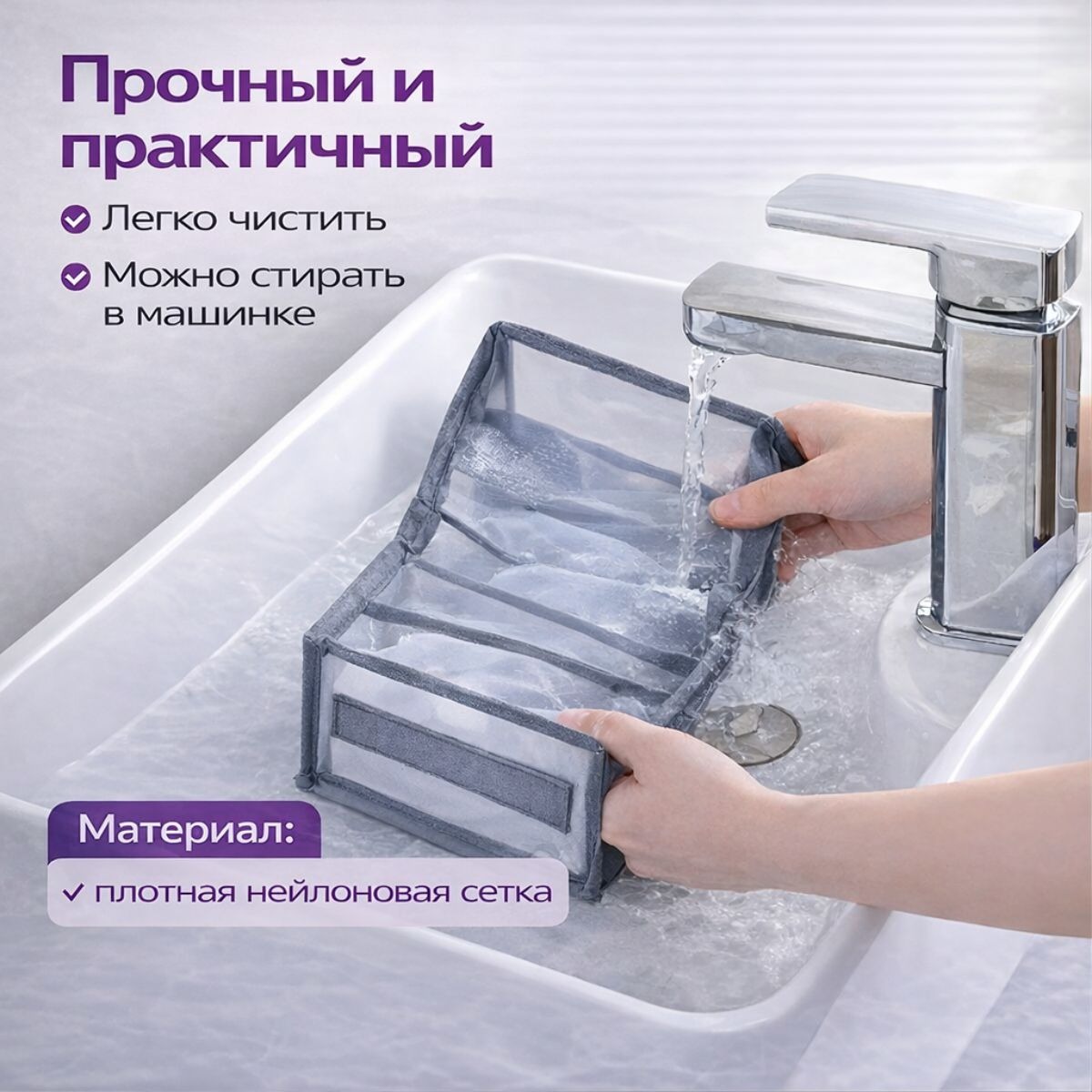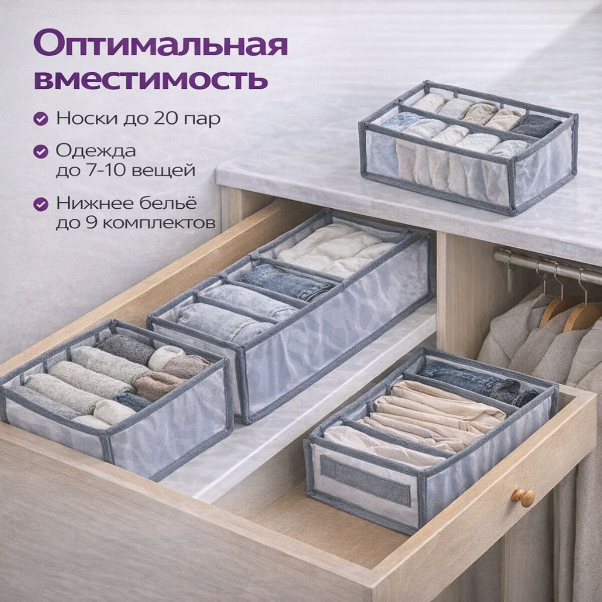 Конструкция позволяет хранить вещи аккуратно и компактно, а при необходимости перемещать органайзер целиком. Подходят для хранения белья, футболок, шорт, леггинсов, аксессуаров и других предметов гардероба.