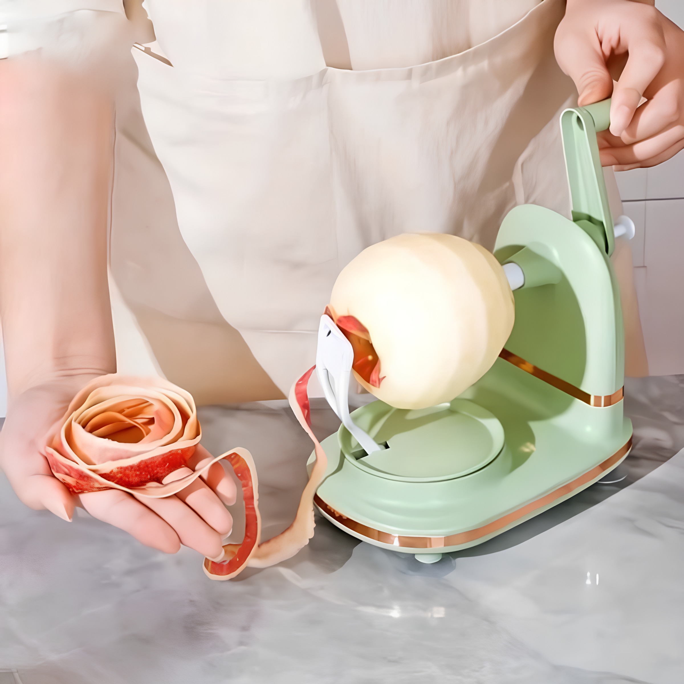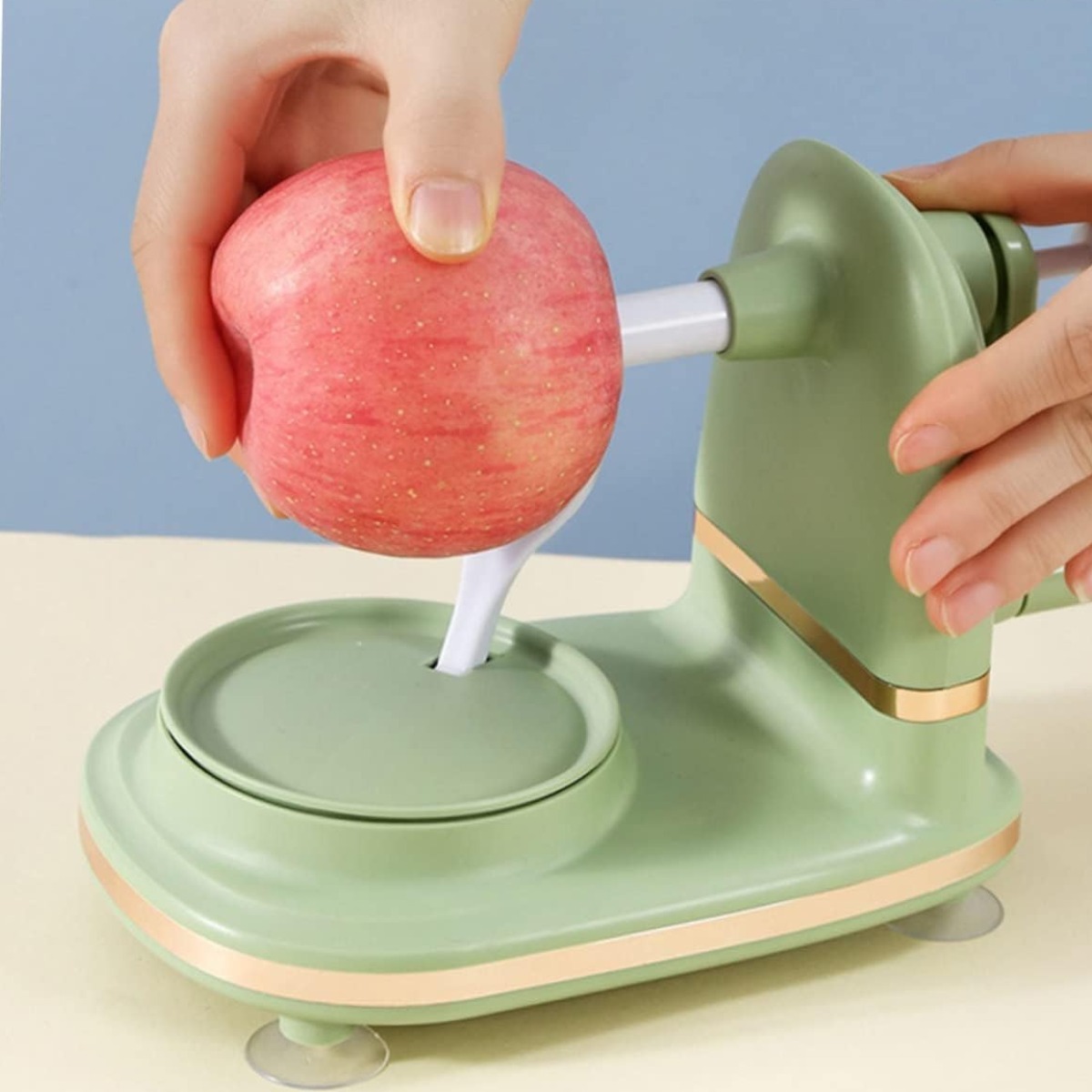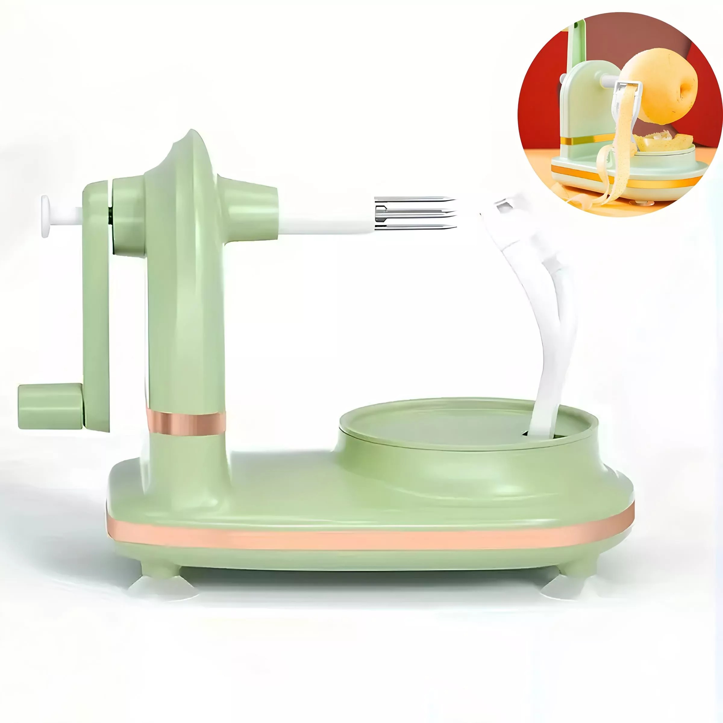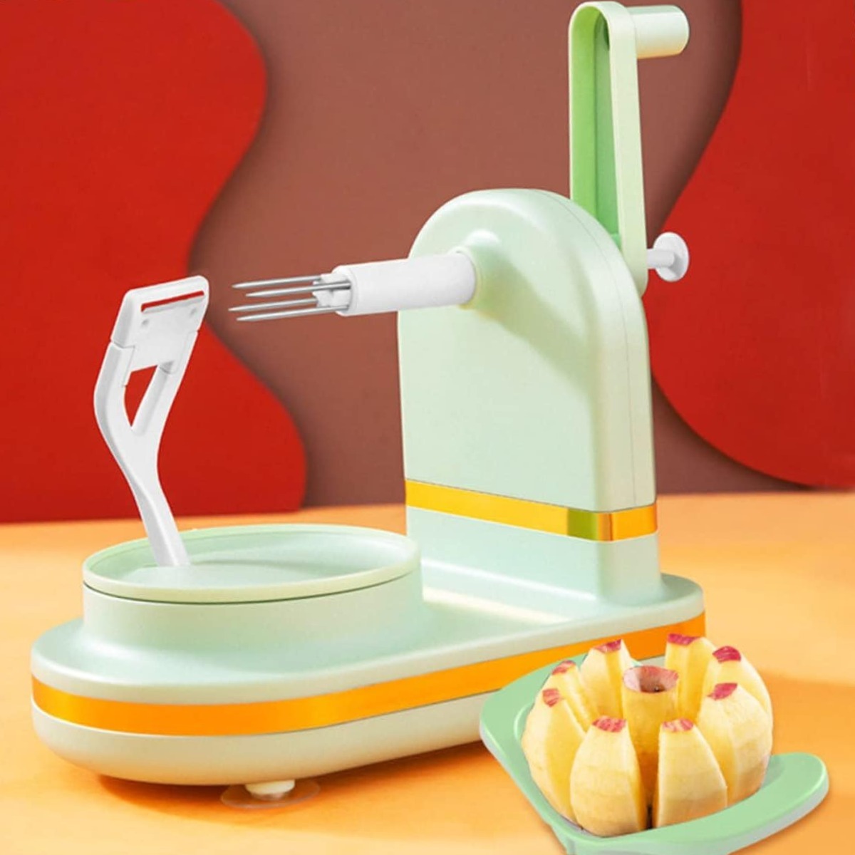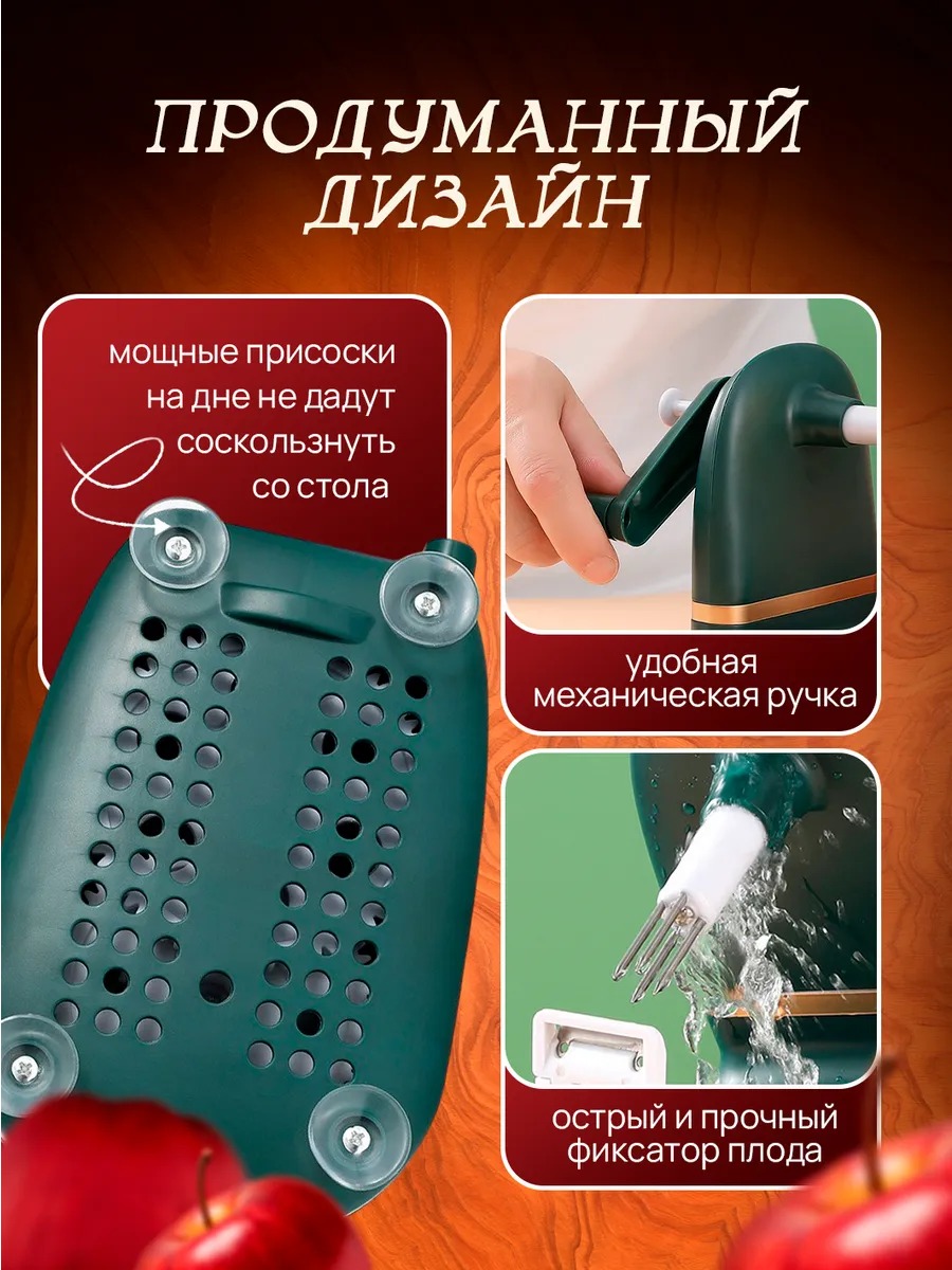 Модель оснащена ручным механизмом, благодаря которому яблоко легко очищается без лишних усилий. В комплект также входит нож для нарезки яблок на дольки, который подходит не только для фруктов, но и для картофеля и других овощей. Компактная конструкция не занимает много места на кухне, а устойчивое основание обеспечивает комфорт во время использования.