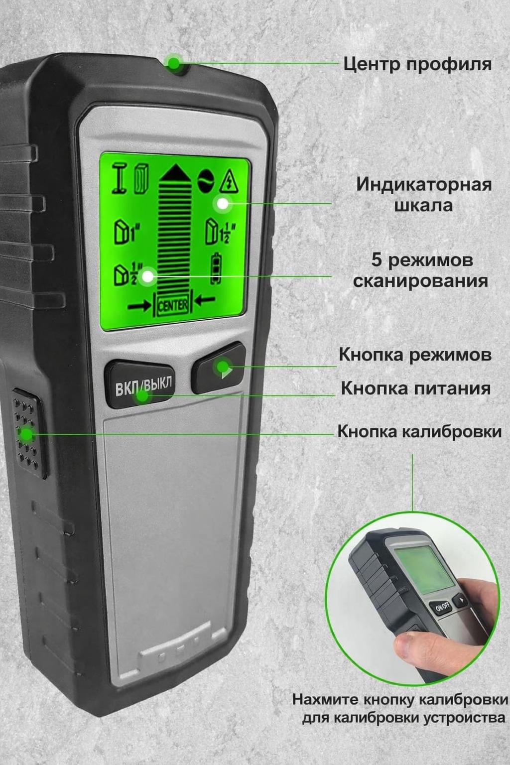 Особенность модели TH-430 — 5 режимов работы: три режима поиска деревянных и металлических элементов на разной глубине, режим поиска проводки и режим металлодетектора. Во всех режимах прибор дополнительно выполняет поиск кабеля под напряжением и предупреждает о наличии переменного тока, что повышает безопасность при работе.