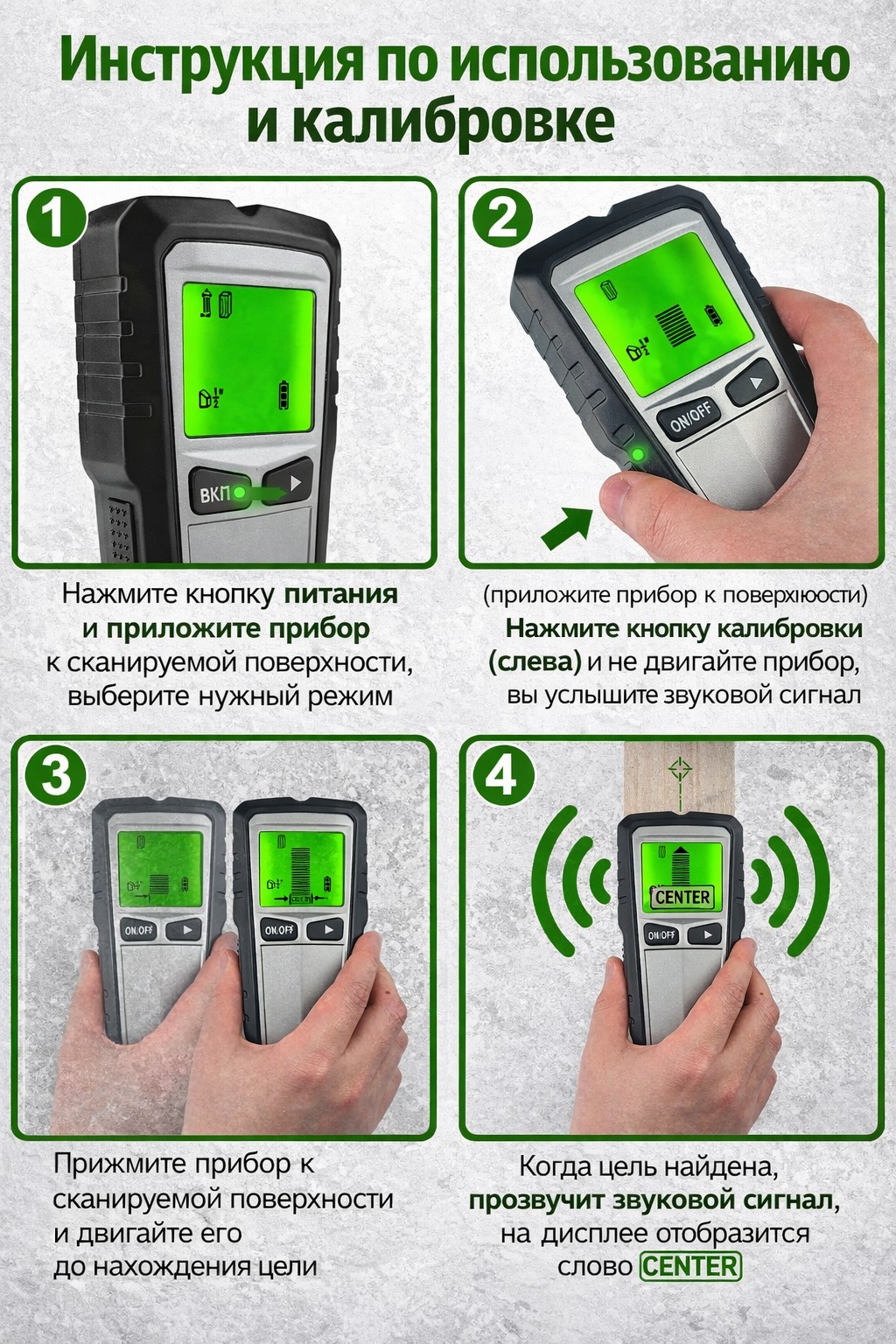 Прибор оснащен ЖК-дисплеем, на котором отображается вся необходимая информация, а также звуковой и визуальной индикацией для удобной и безопасной работы. Автоматическая калибровка облегчает использование и помогает быстрее подготовить прибор к сканированию поверхности. Простое кнопочное управление делает детектор удобным как для домашнего мастера, так и для профессионала.