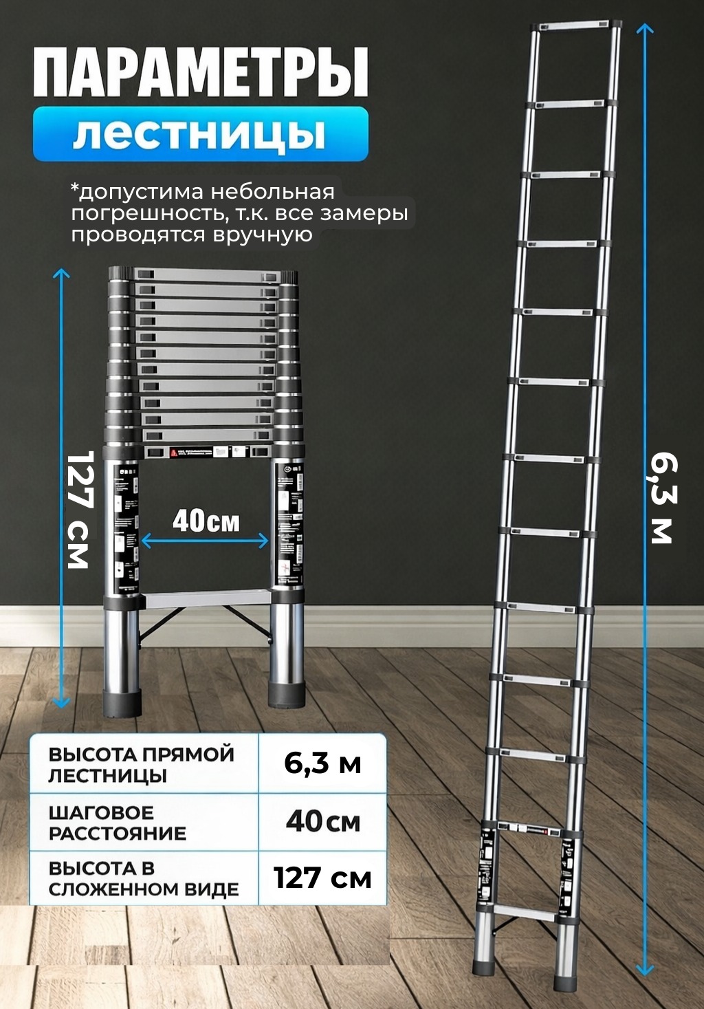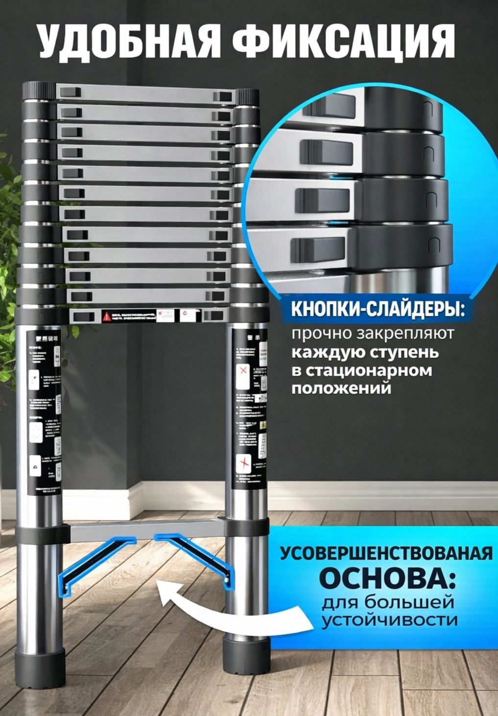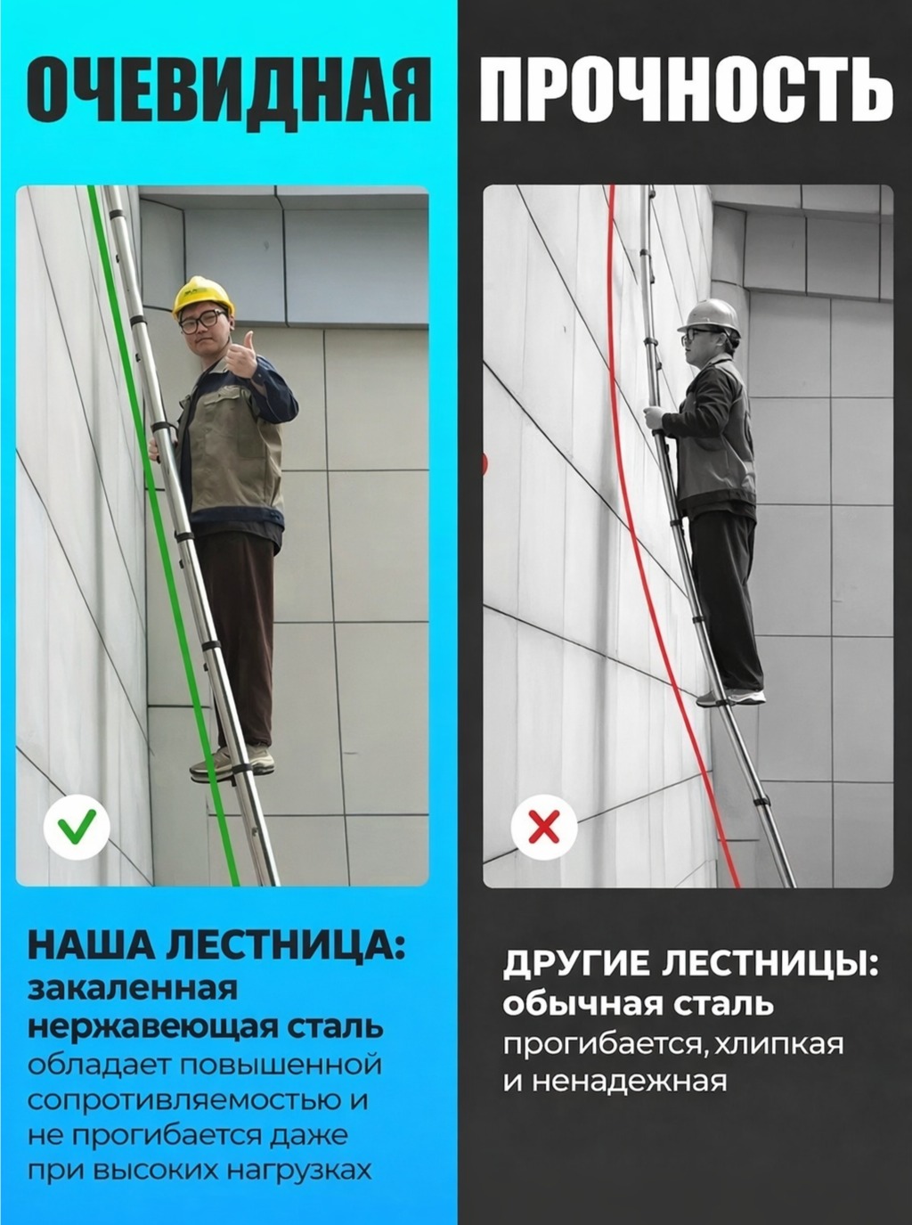 Телескопическая стальная лестница — это надёжное и универсальное решение для работы на высоте как в быту, так и в профессиональной сфере. Благодаря продуманной конструкции она легко раскладывается до максимальной высоты и компактно складывается для удобного хранения и транспортировки.