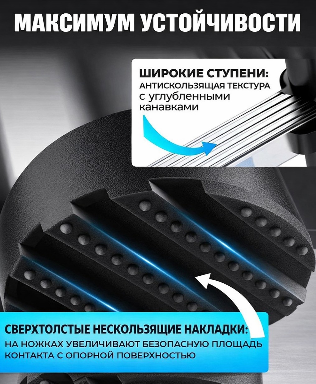 Изготовлена из нержавеющей стали, лестница отличается повышенной прочностью и долговечностью. Она устойчива к коррозии, механическим повреждениям и выдерживает интенсивное использование. Надёжные фиксаторы обеспечивают безопасную фиксацию каждой секции, а антискользящие ступени добавляют комфорт и уверенность во время работы.