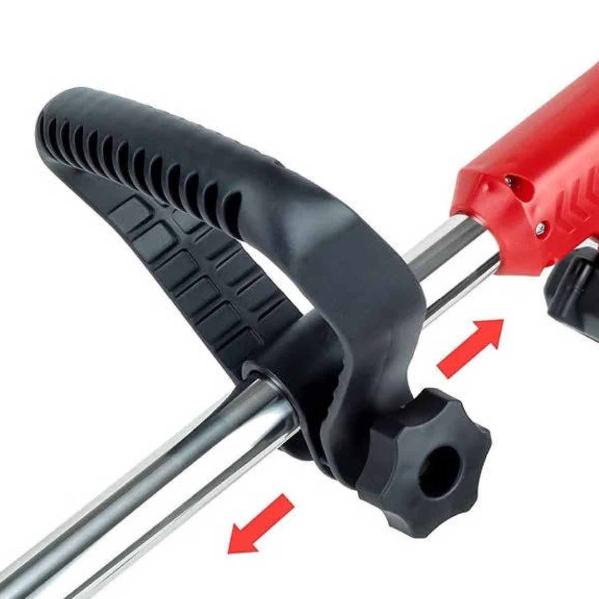 Триммер оснащен телескопической штангой, которая регулируется по длине в диапазоне 92–122 см, благодаря чему инструмент удобно настроить под рост пользователя. Наличие колесной базы помогает снизить нагрузку на руки и делает работу более точной и комфортной. Прорезиненная рукоятка и дополнительная передняя ручка обеспечивают надежный хват и хороший контроль во время работы.