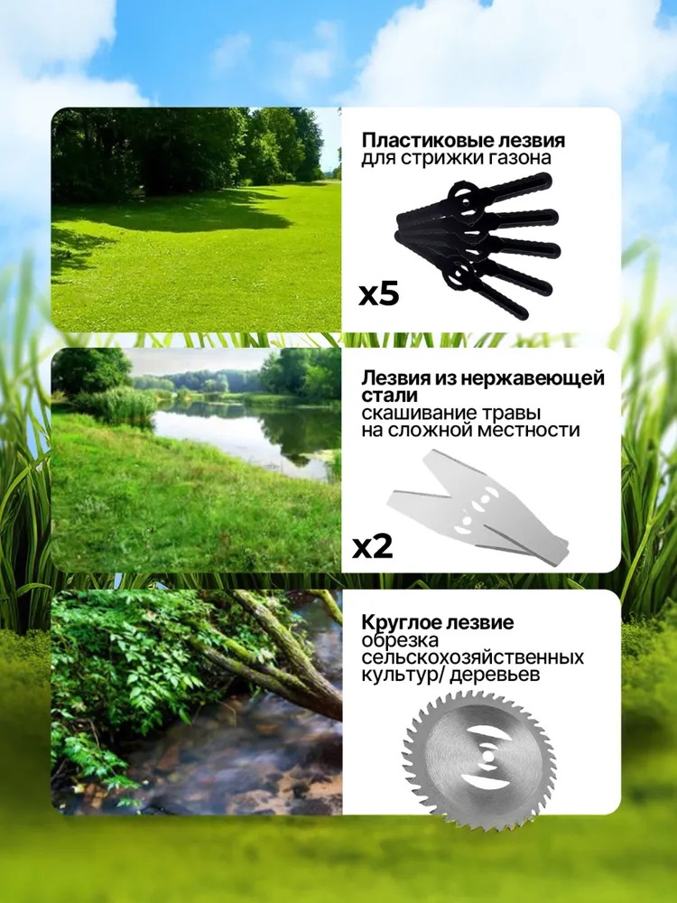нейлоновые лезвия — для мягкой травы и аккуратной подрезки;