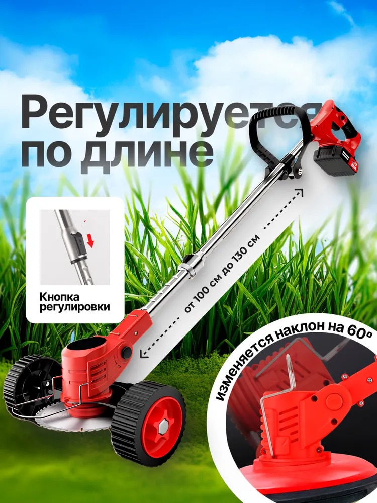Аккумуляторный триммер для травы с телескопической ручкой и колесами — удобный, легкий и многофункциональный инструмент для ухода за газоном, травой, сорняками и участком вокруг дома. Модель сочетает в себе комфорт, безопасность и практичность, позволяя легко справляться как с мягкой травой, так и с более плотной растительностью.