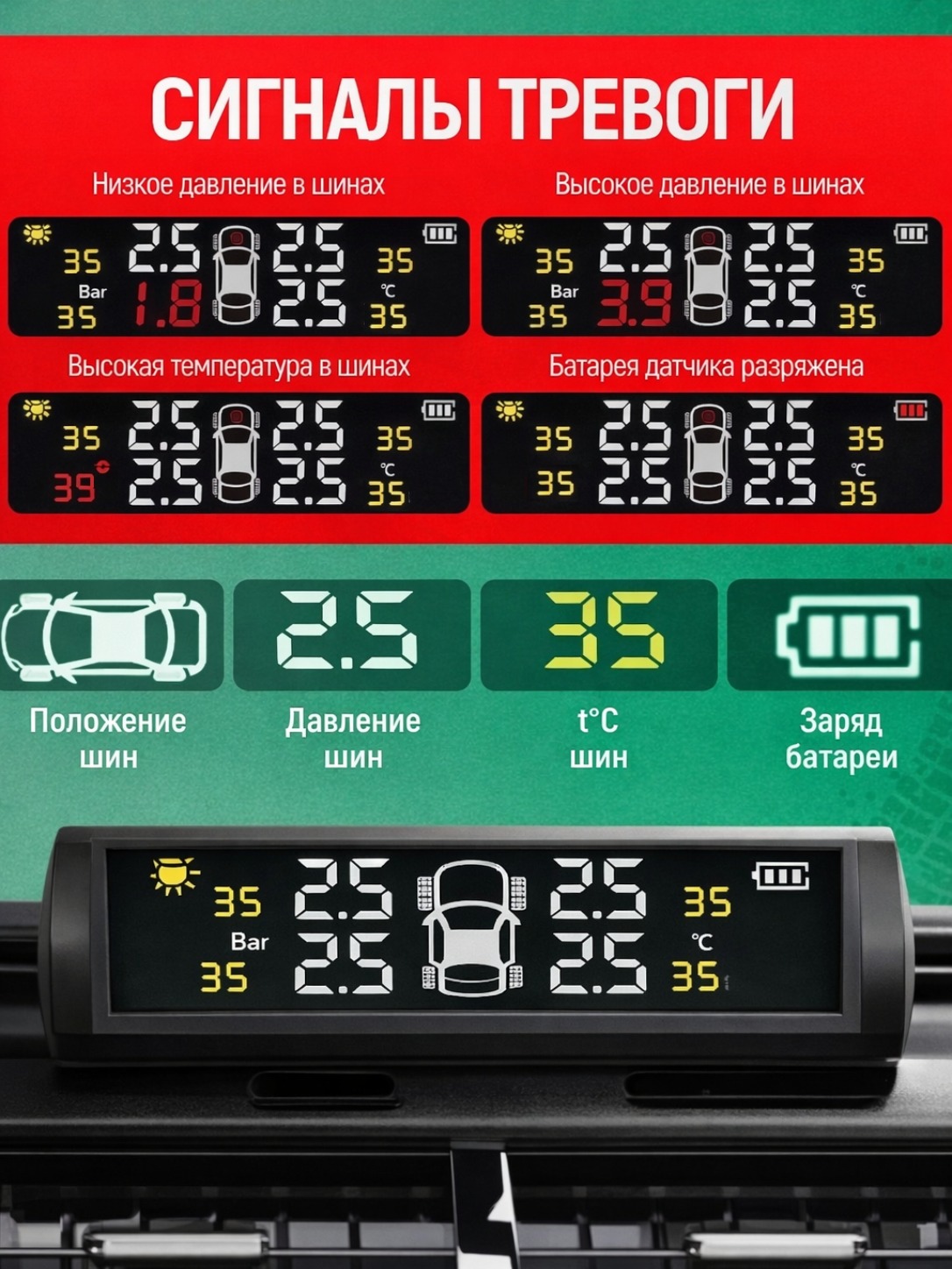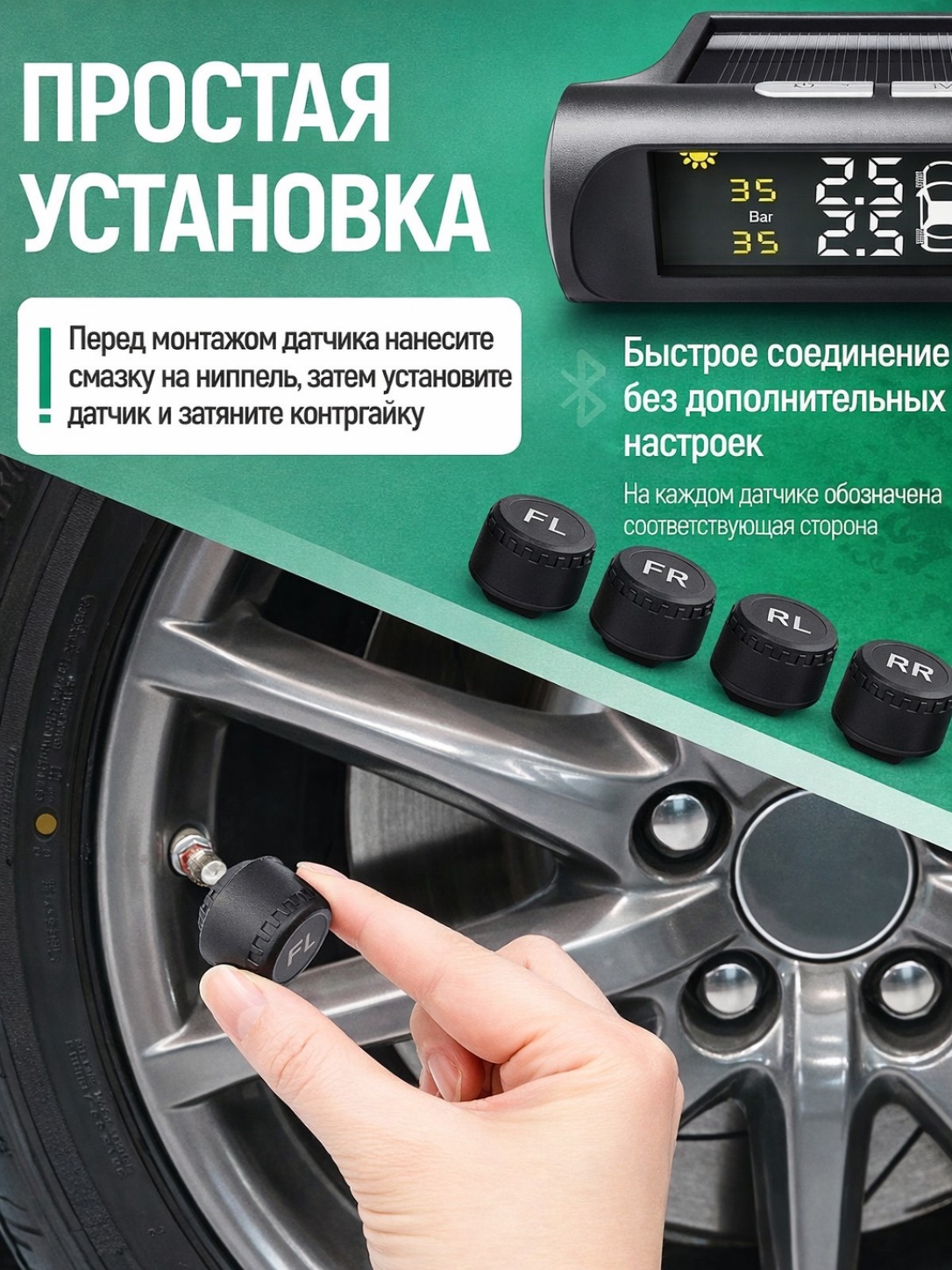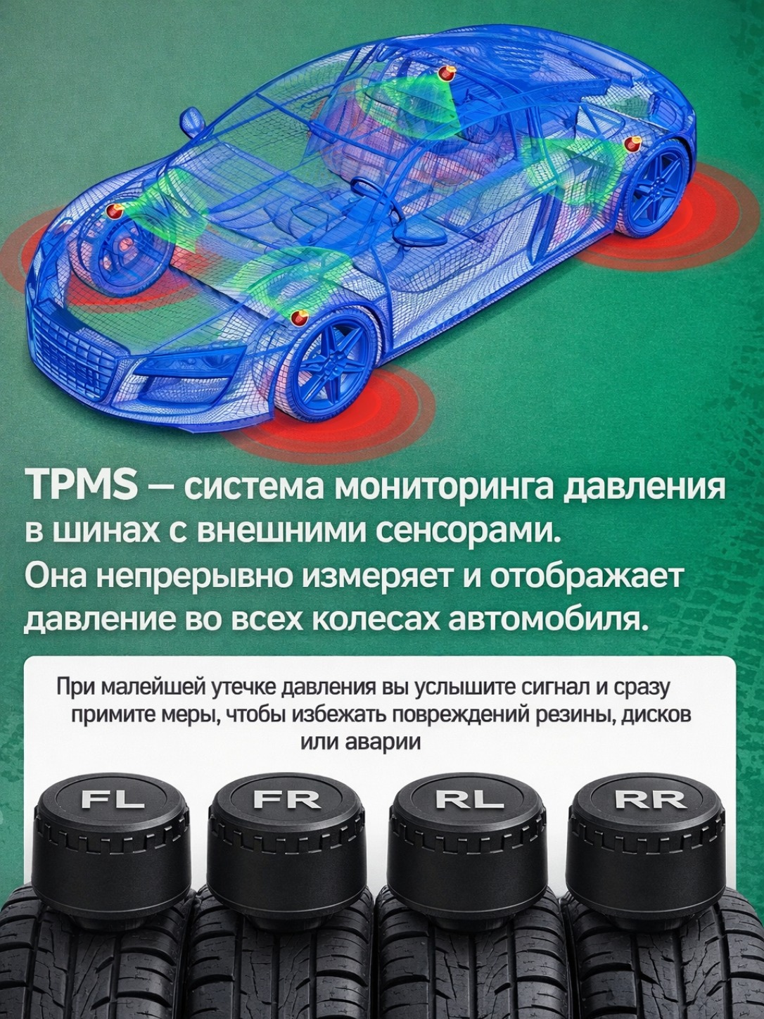 Универсальная система контроля давления в шинах TPMS Solar — это современное устройство для постоянного мониторинга состояния колес автомобиля в режиме реального времени. Система позволяет контролировать давление и температуру в каждой шине, что напрямую влияет на безопасность движения и управляемость автомобиля.