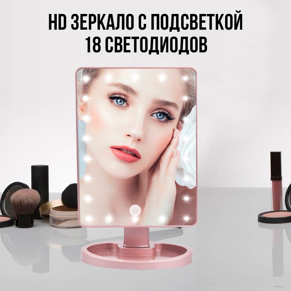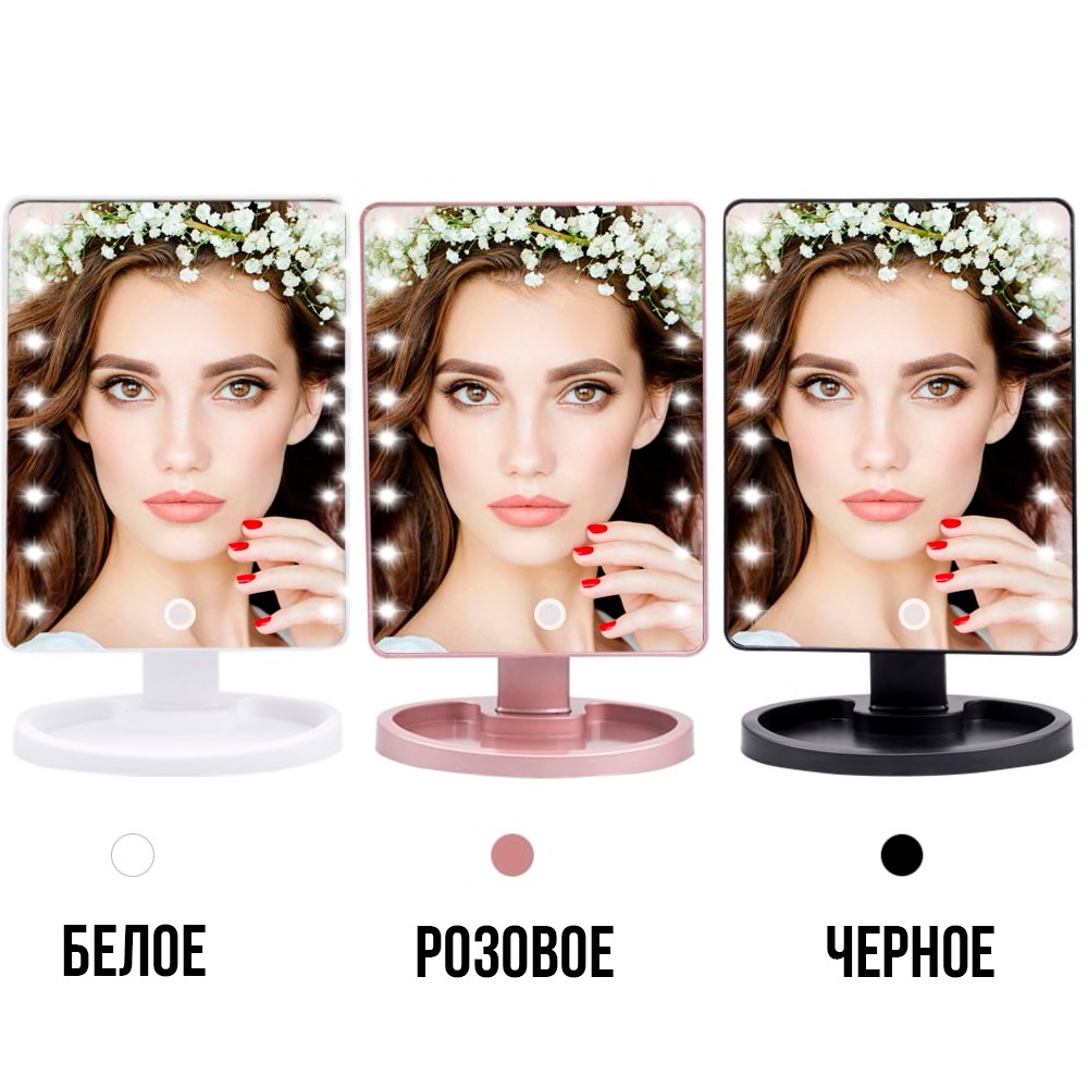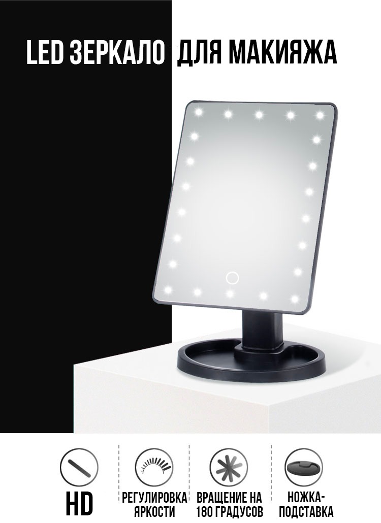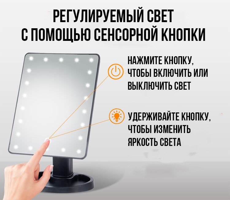Преимущества — широкая отражающая поверхность; регулируемое вращение на 180°; светодиодная подсветка для качественного макияжа; сенсорное управление подсветкой; подставка для косметики и украшений.