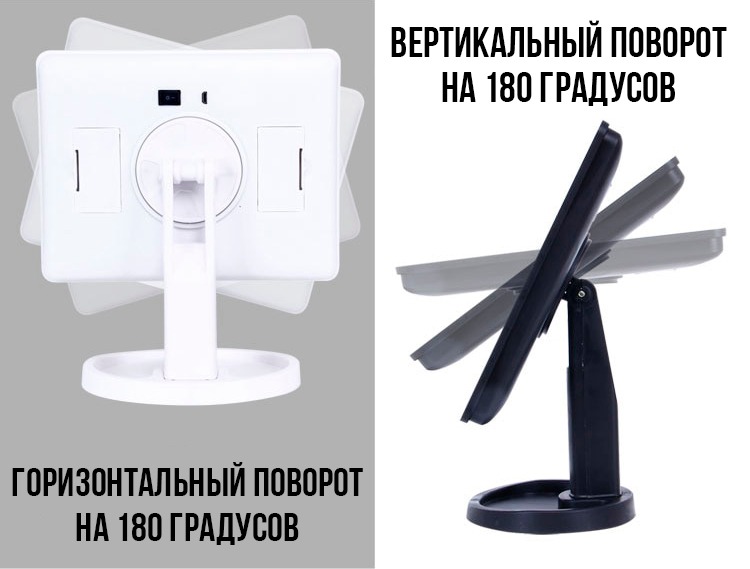 Удобная подставка — специальная подставка позволит разместить на ней различные косметические мелочи, например, губную помаду, пудру, тени для глаз или что-нибудь другое, а свободное вращение на 180° позволяет зафиксировать косметическое зеркало в удобном для вас положении. Зеркало для макияжа с LED подсветкой Magic Makeup Mirror имеет изысканный, элегантный вид и украсит собой интерьер в доме.