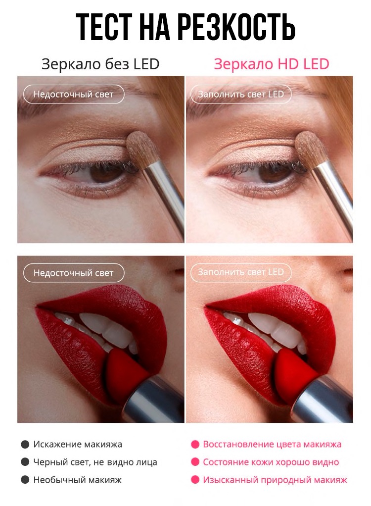 Идеальное освещение — яркие светодиоды обеспечивают равномерное освещение лица со всех сторон в любое время суток, что позволит вам равномерно нанести косметику, не допуская ошибок.