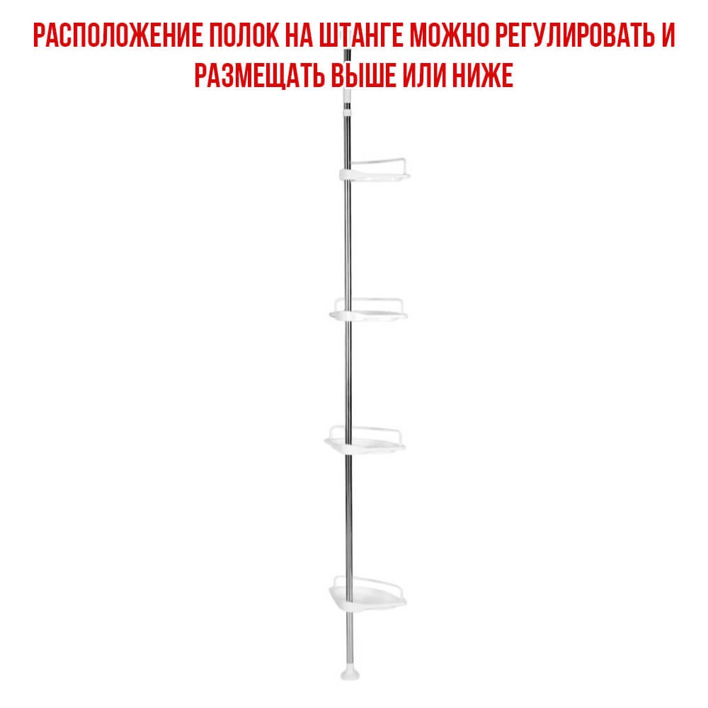 Устанавливается данная полка от пола и до потолка и фиксируется за счет пружинного механизма. Длина штанги полки регулируется от 254 до 320 см. Расположение полок на штанге можно регулировать и размещать выше или ниже.