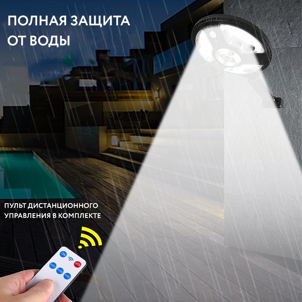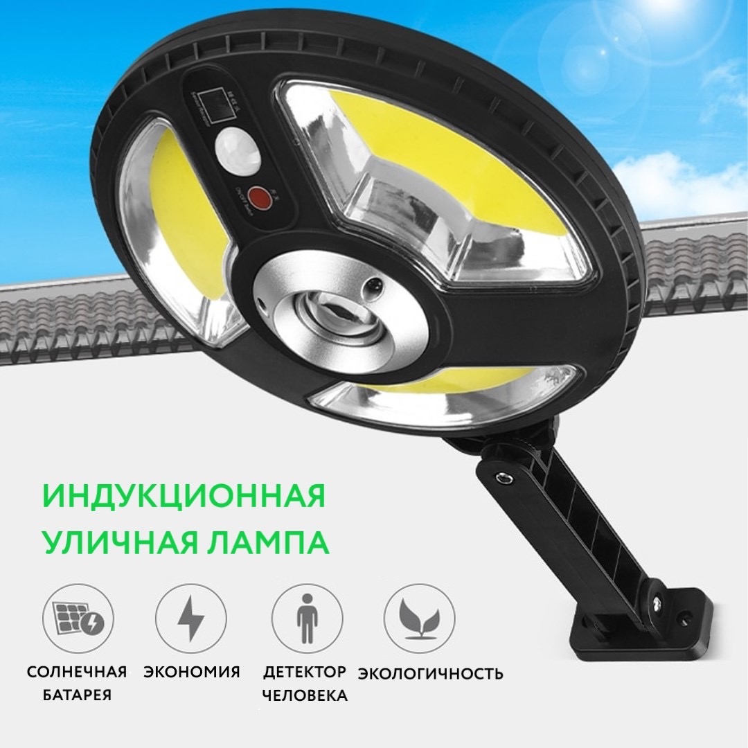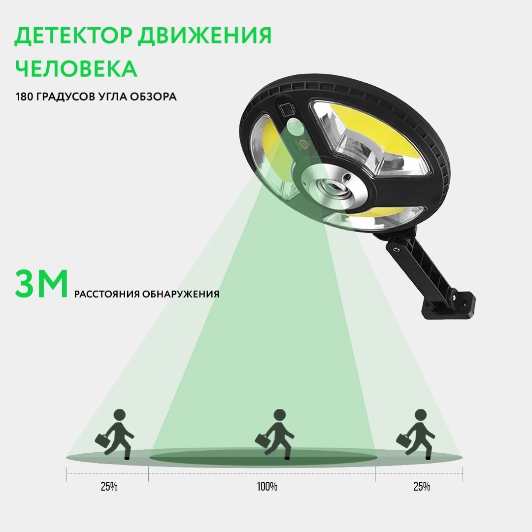 Предназначен для автономного освещения территории. Светильник работает от солнечных батарей и поэтому вам не нужно беспокоиться о его зарядке или подключении к сети. Датчик движения срабатывает с расстояния 7-9 метров, при углу обзора 120 градусов. Время работы при полном заряде аккумулятора до 1-2 дней. Встроенных 3 режима работы (полный, 50% от мощности при неактивной работе, 100% мощности при движении, 50% мощности).