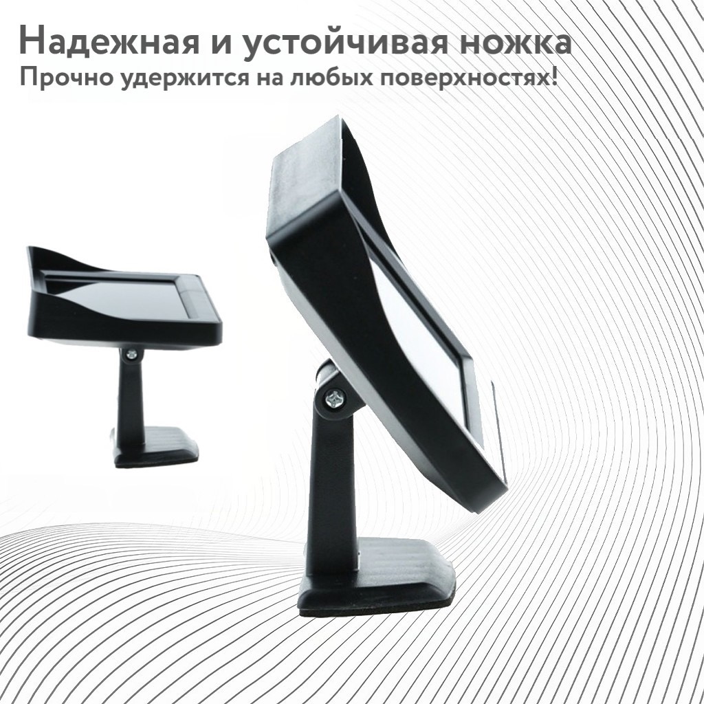 Монитор размером экрана 4,3 дюйма для просмотра изображения с камеры заднего вида автомобиля. Монитор устанавливается на переднюю панель автомобиля с помощью 2-х стороннего скотча на нижней стороне опоры. Опора и корпус монитора соединены шарнирно, и можно установить удобный для просмотра угол вертикального наклона поверхности экрана. В комплект поставки входит рамка, которую можно надеть на корпус монитора и получить защитный козырек над экраном.