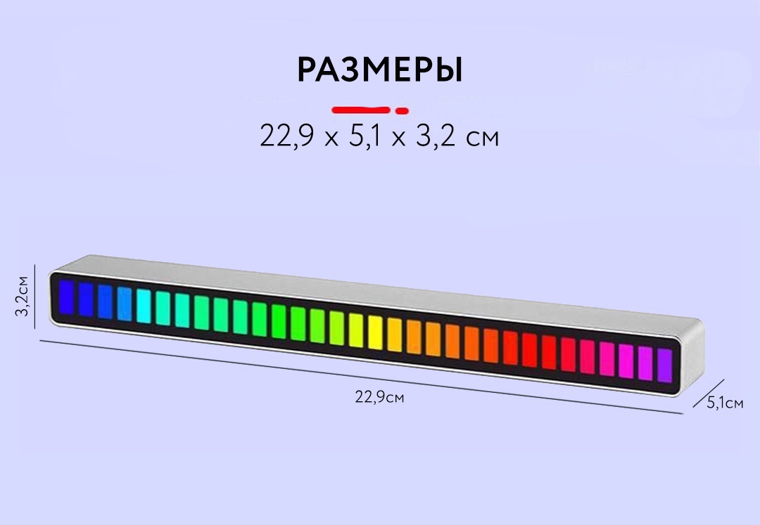 - Прекрасные визуальные эффекты Многоцветная музыкальная подсветка RGB с регулируемым звуком имеет встроенный высокочувствительный силиконовый микрофон.- Отлично подходит для любителей музыки Индикатор звукового спектра музыкального света отличается инновационным дизайном и идеальным сочетанием музыки и искусства. Он подходит как меломанам, так и любителям электроники, и в то же время его можно использовать как приятное художественное украшение. Когда вы включаете музыку, красочные уровни светятся вместе с ритмом. Выразительно помогают создать атмосферу дома Вы можете поставить его на свой стол, компьютер, тумбочку или машину, чтобы создать расслабляющую и увлекательную атмосферу.