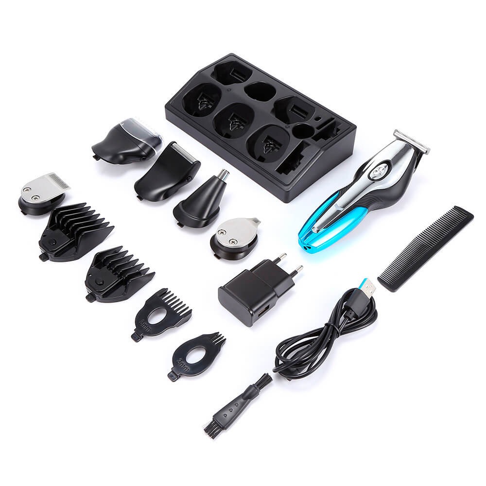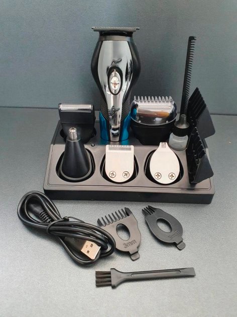- Комплектация: Машинка, съемный триммер для стрижки, 4 насадки, съемный окантовочный триммер, съемный триммер для носа и ушей, съемный триммер для точного формирования контуров, съемная сеточная бритва, съемный триммер для тела, зарядное устройство + кабель, кисточка для чистки, расческа, подставка, инструкция.