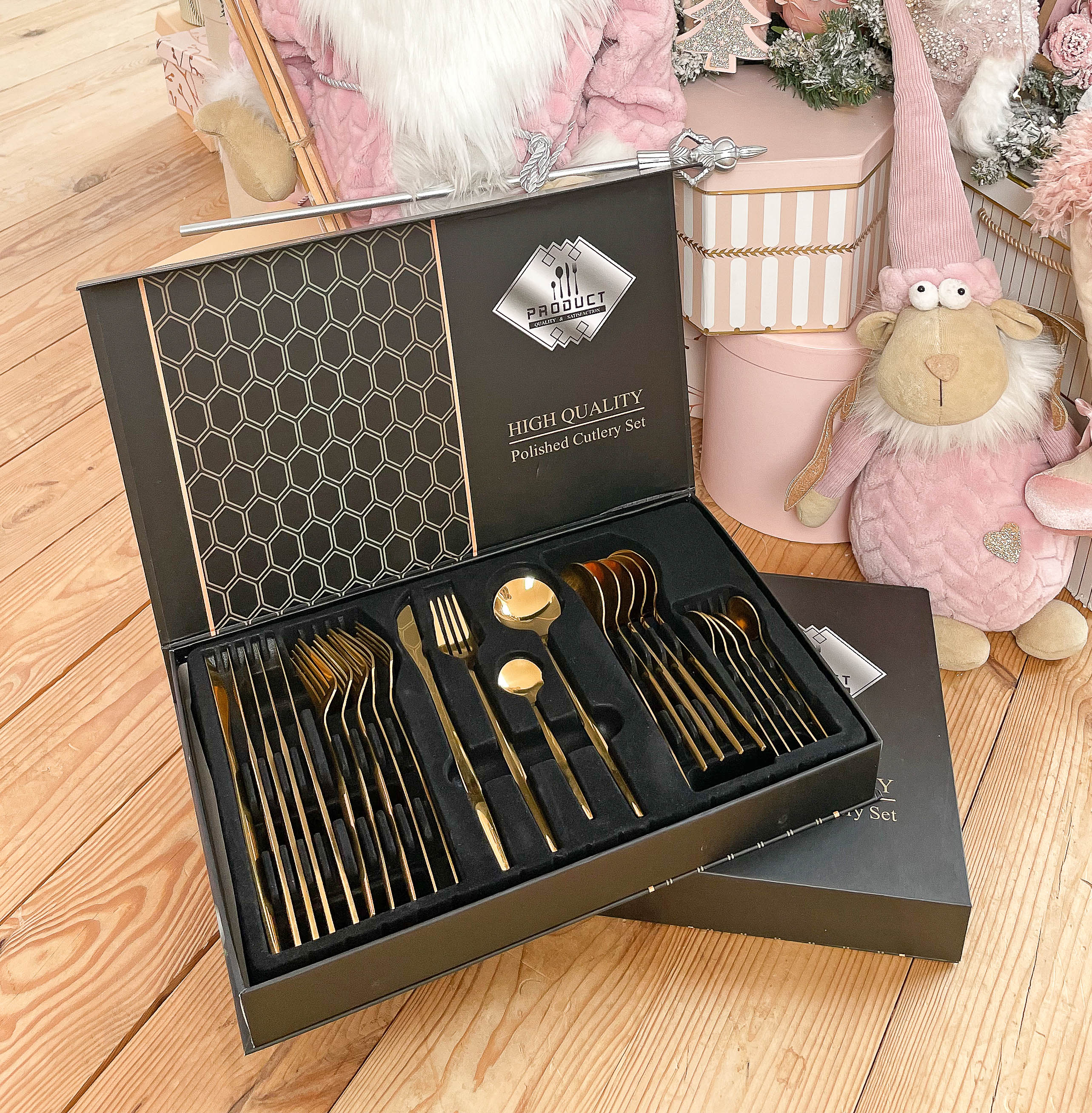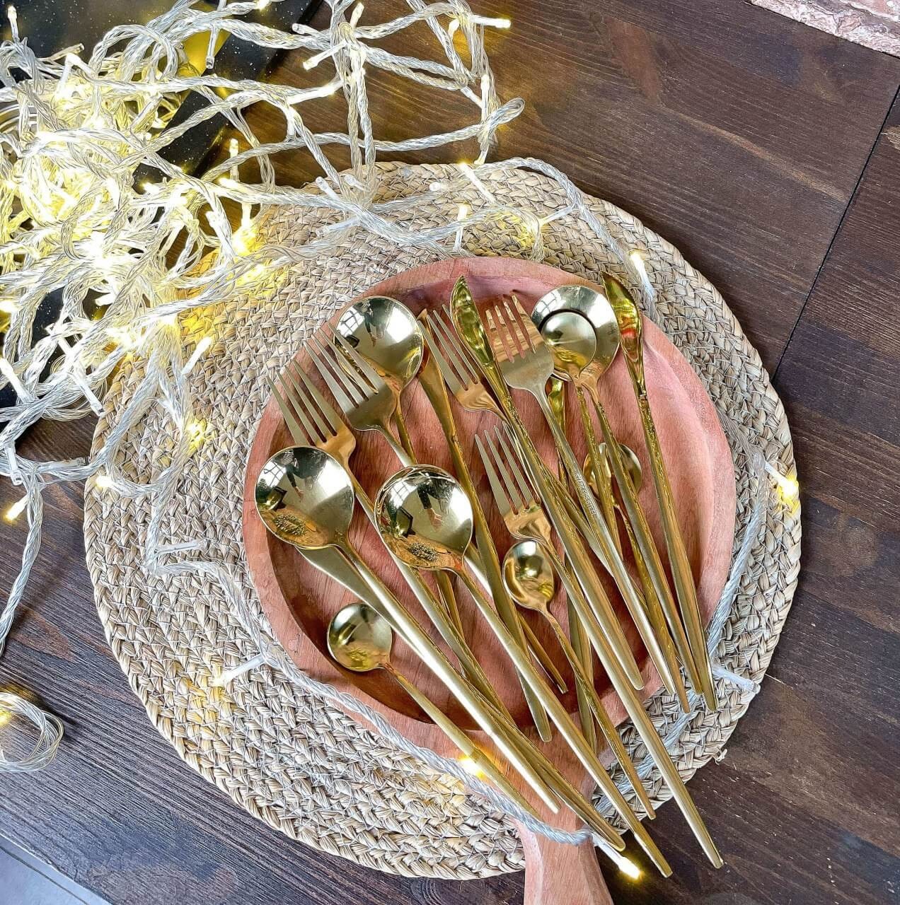 Кількість приборів: 6 виделок, 6 ножів, 6 ложок, 6 десертних ложечок Кількість персон: 6 персон Колір: Золотий Підходить: Для сервіровки святкових столів, на подарунок