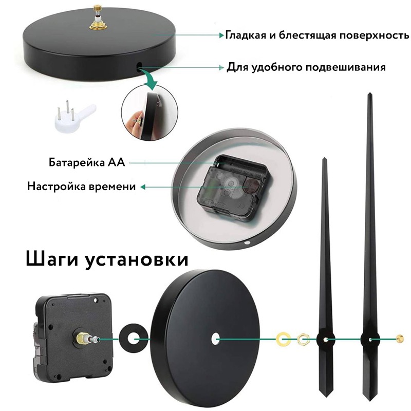 | Функции | Бесшумный кварцевый механизм, регулируемый размер, 3D дизайн |