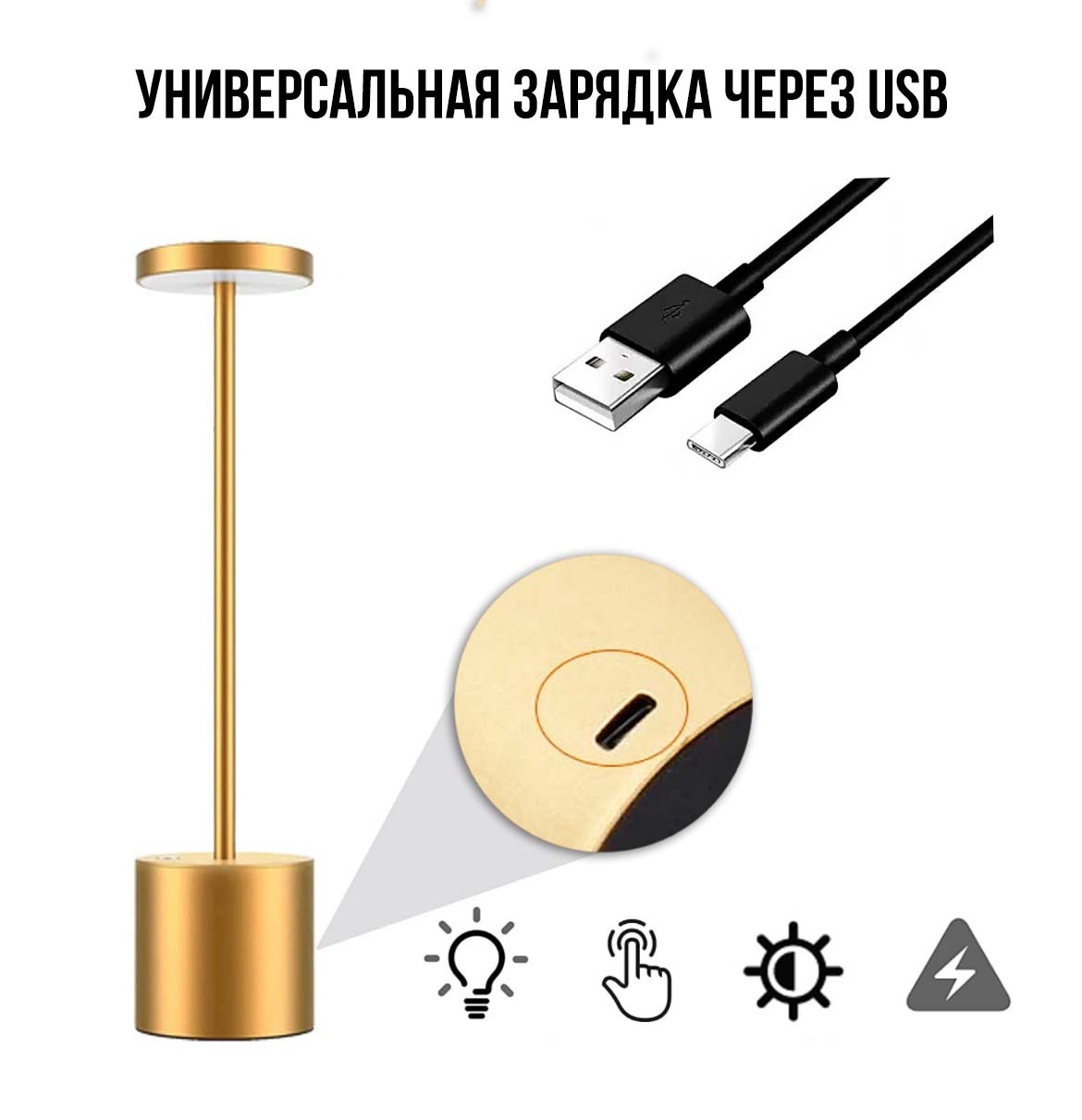 Аккумуляторная настольная LED лампа с сенсорной кнопкой включения и 3 режимами яркости. Минималистичная настольная лампа эффектно подсветит ваше пространство. Благодаря встроенному аккумулятору, вы можете разместить лампу в любом месте: в спальне, кабинете, офисе, гостинной, столовой, кафе, гостиничных номерах и т.д. Основные преимущества: - Изготовлена из алюминиевого сплава: лампа с питанием от аккумулятора, универсальная зарядка через USB, может быть подключена к любому USB-порту (включая ноутбук, компьютер, блок питания телефона, павербанк и т.п.);
