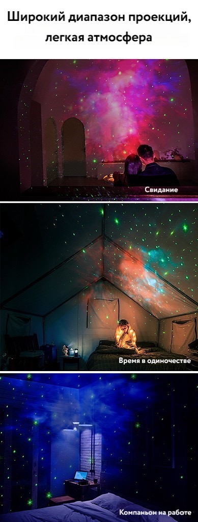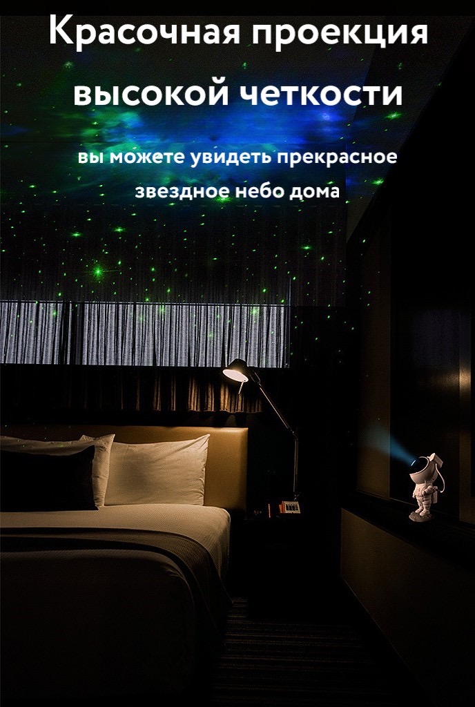 С LED-светильником Космонавт каждый вечер можно наблюдать за яркими разноцветными картинками разных галактик прямо из своей кровати.