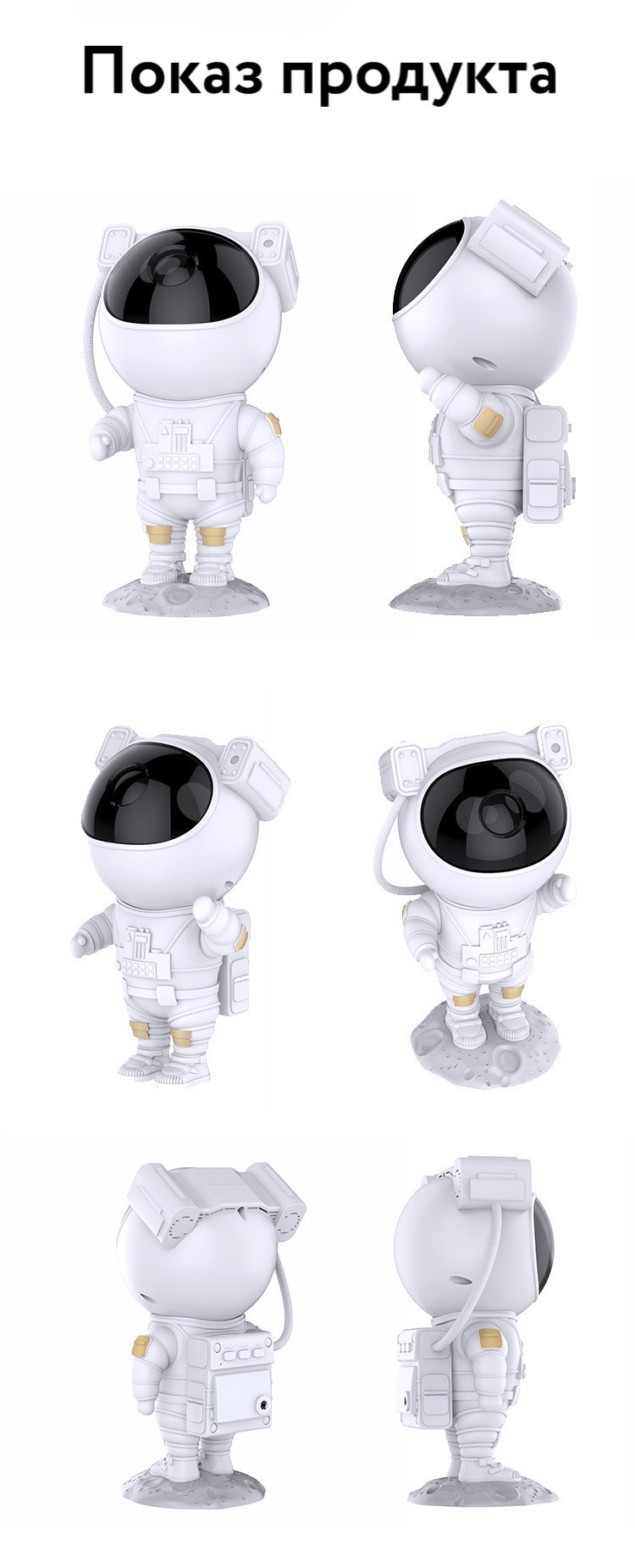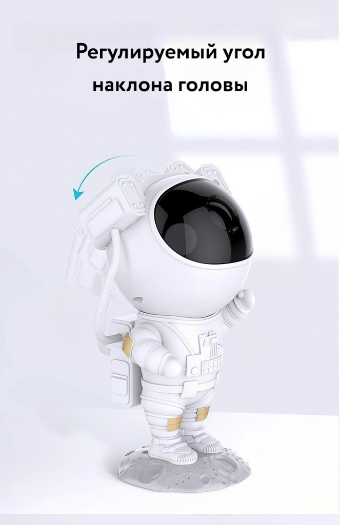 Проектор-светильник Космонавт имеет подвижные руки (могут вращаться вокруг своей оси). Также меняется положение головы, благодаря креплению к телу магнитной абсорбцией (можно повернуть в разные стороны под углом до 90 градусов). На шлеме фигурки размещена камера самого проектора, то есть поворачивая голову астронавта, вы можете менять положение изображения-проекции.