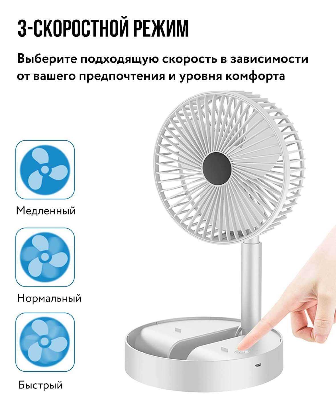 Складной USB вентилятор с телескопической ножной. Три режима мощности