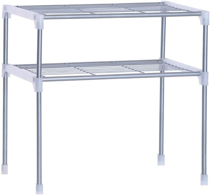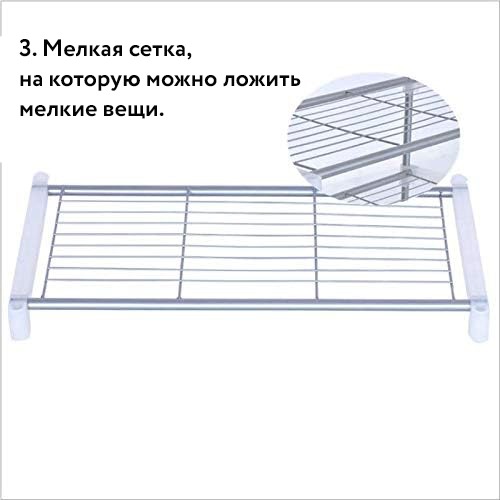 Универсальная телескопическая полка органайзер для микроволновки или другой бытовой техники. Каркас выполнен из металлических трубок, соединенных пластиковыми креплениями. Решетчатая поверхность не накапливает пыль и очень проста в уборке.