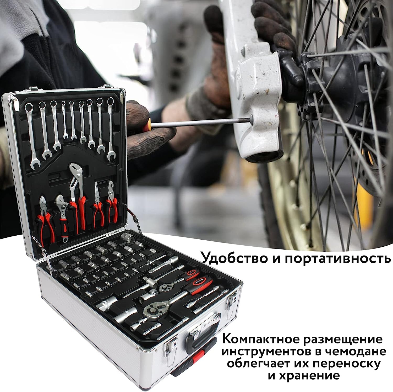 Четырехуровневый чемодан предусматривает хранение инструментов в правильном логическом порядке и обеспечивает быстрый доступ к деталям, а телескопическая ручка и колёсики на корпусе чемодана, позволят легко и быстро его транспортировать.