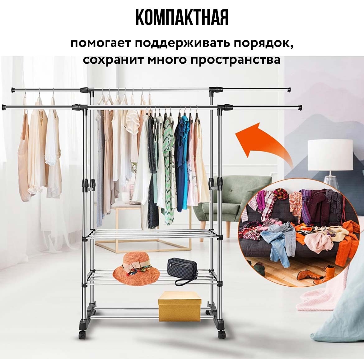 Двойная телескопическая вешалка для одежды с полками для обуви 80х36х160 см