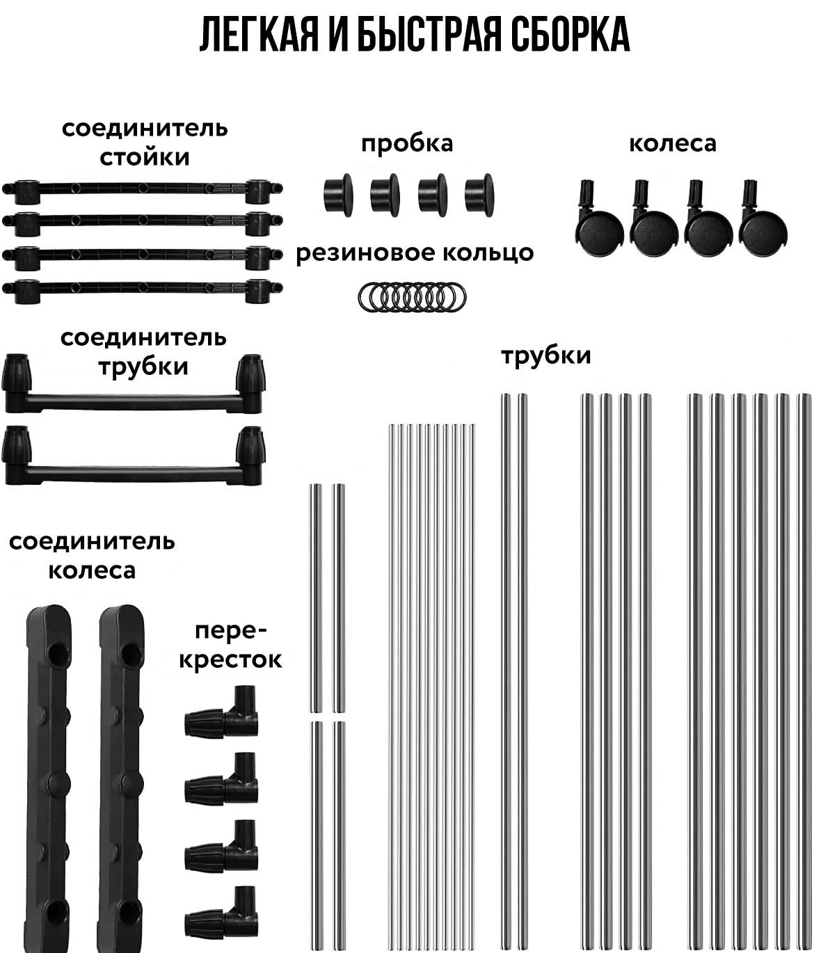 | Дополнительные функции | Наличие колесиков для транспортировки, возможность удлинения и изменения высоты, пластиковые заглушки на концах трубок |